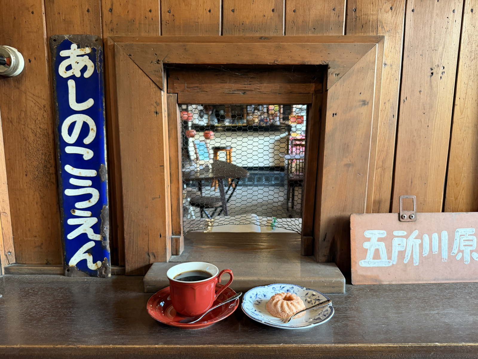 元・駅の窓口と駅舎珈琲、りんご焼きどーなつ りんごを使ったメニューがいろいろある中で、りんご焼きどーなつと駅舎珈琲を注文しました。りんご焼きどーなつには青森県産米粉が使われています。プレーンのピンク色は、桜をイメージしているとか。