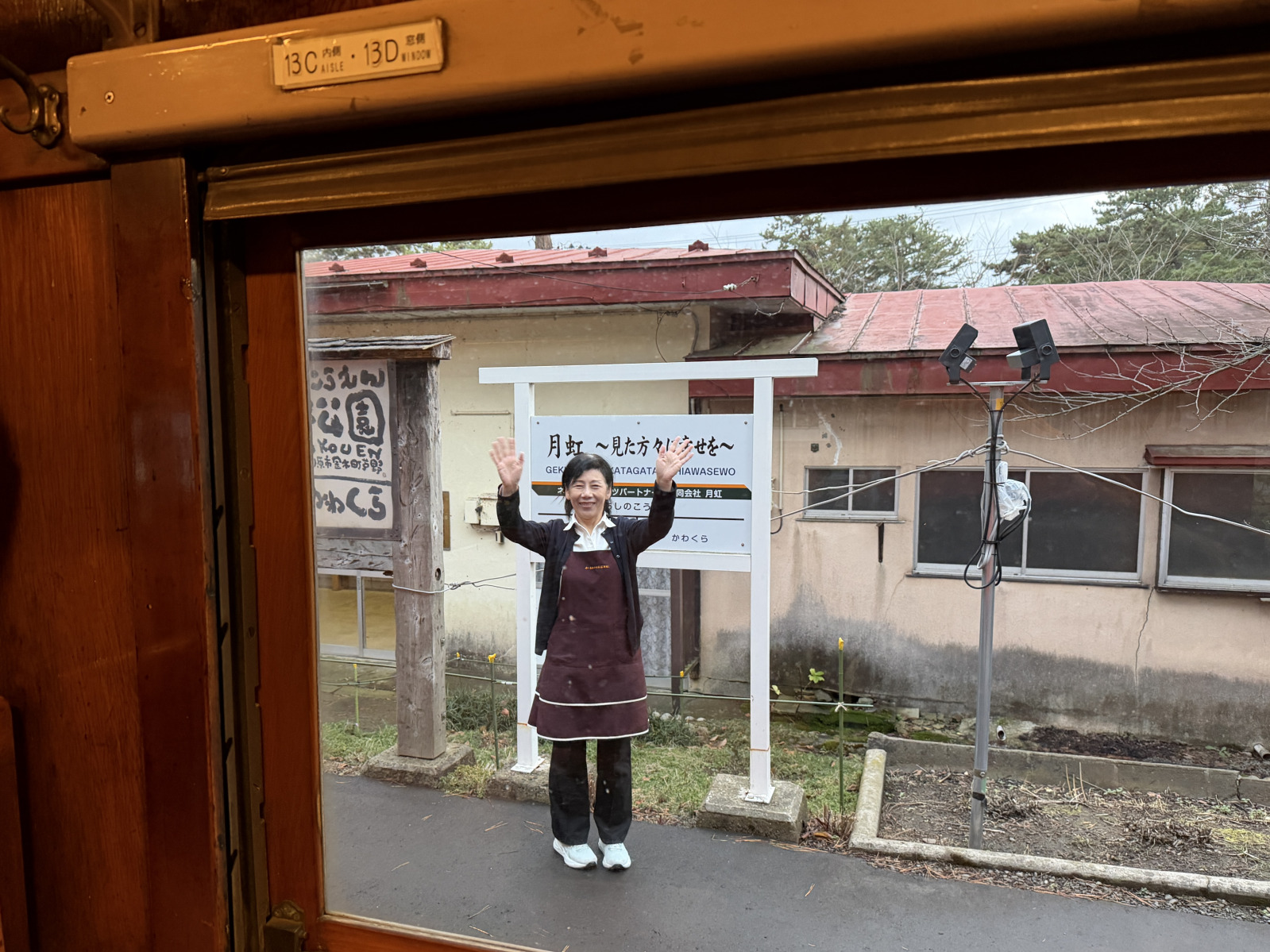 地元出身のオーナー、栄利有夏さんとお話していたら、そろそろ帰りの列車が到着する時間に。名残を惜しみつつ列車に乗り込むと、お見送りしてくださいました。温かいおもてなしに、また来ようという気持ちになります。実際にリピーターさんも多いそうです。