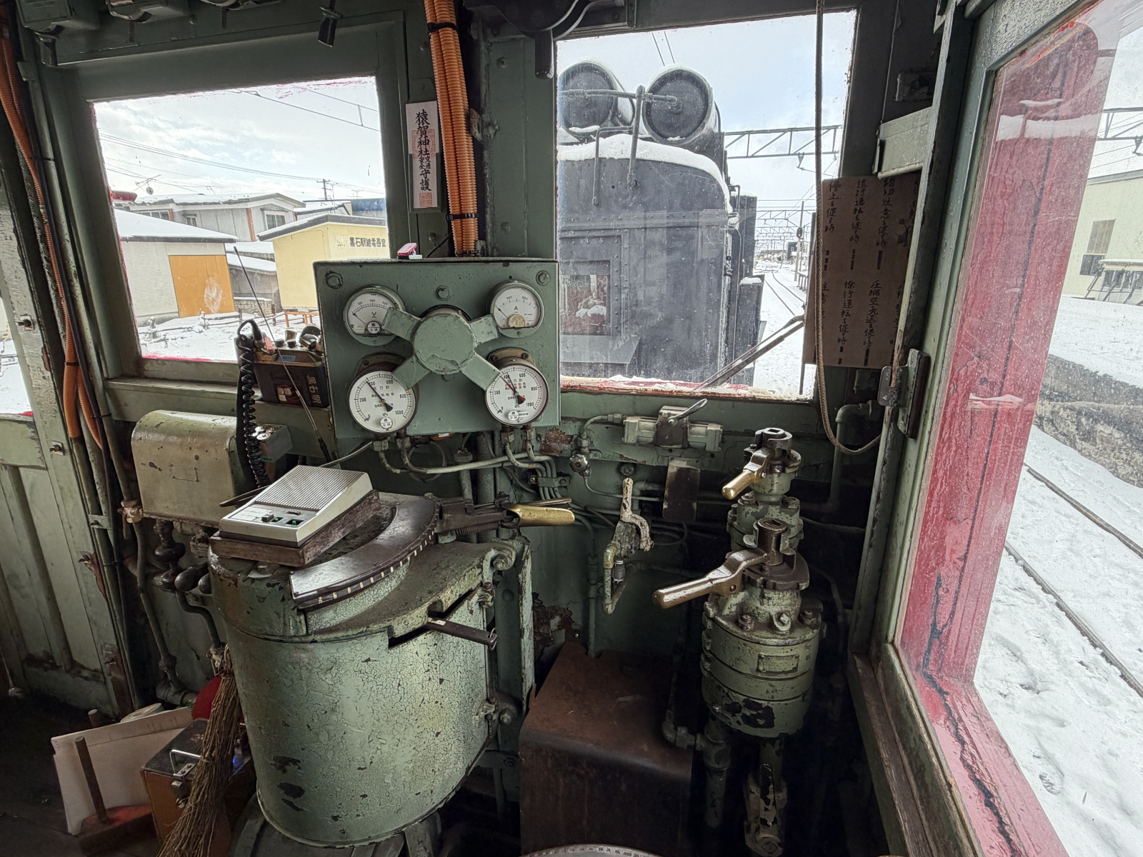 機関車の運転台 運転席に入らせてもらって、いろいろと見物。ラッセル車は主に列車が走行しない時間帯に線路上を走り、前面のくさび形ブレードで雪を左右にかき分けます。さらに横の翼を動かして、雪を線路脇に寄せたりする仕組みなども知ることができました。