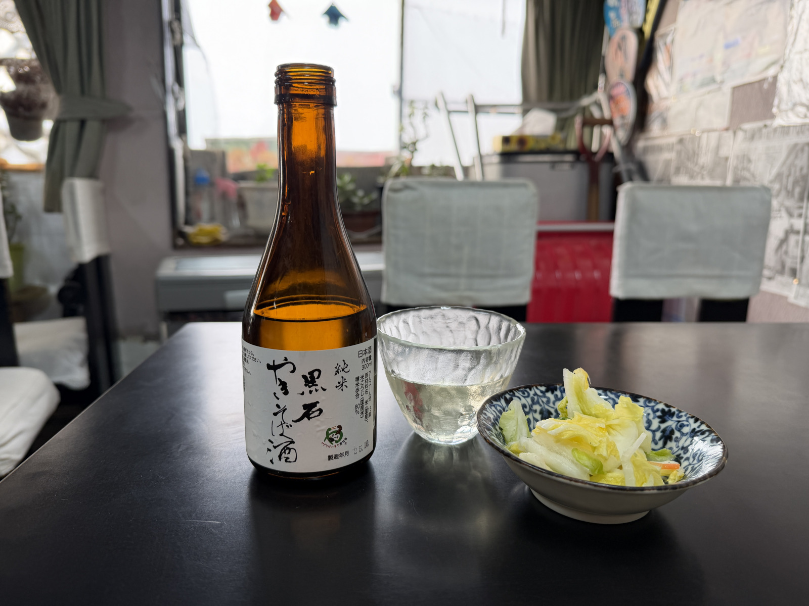 悩みましたが、たった今出てきたお店に再び行くことにしました。そこで新たに見つけた「黒石やきそば酒」を熱燗にしてもらい、それで暖をとりました。