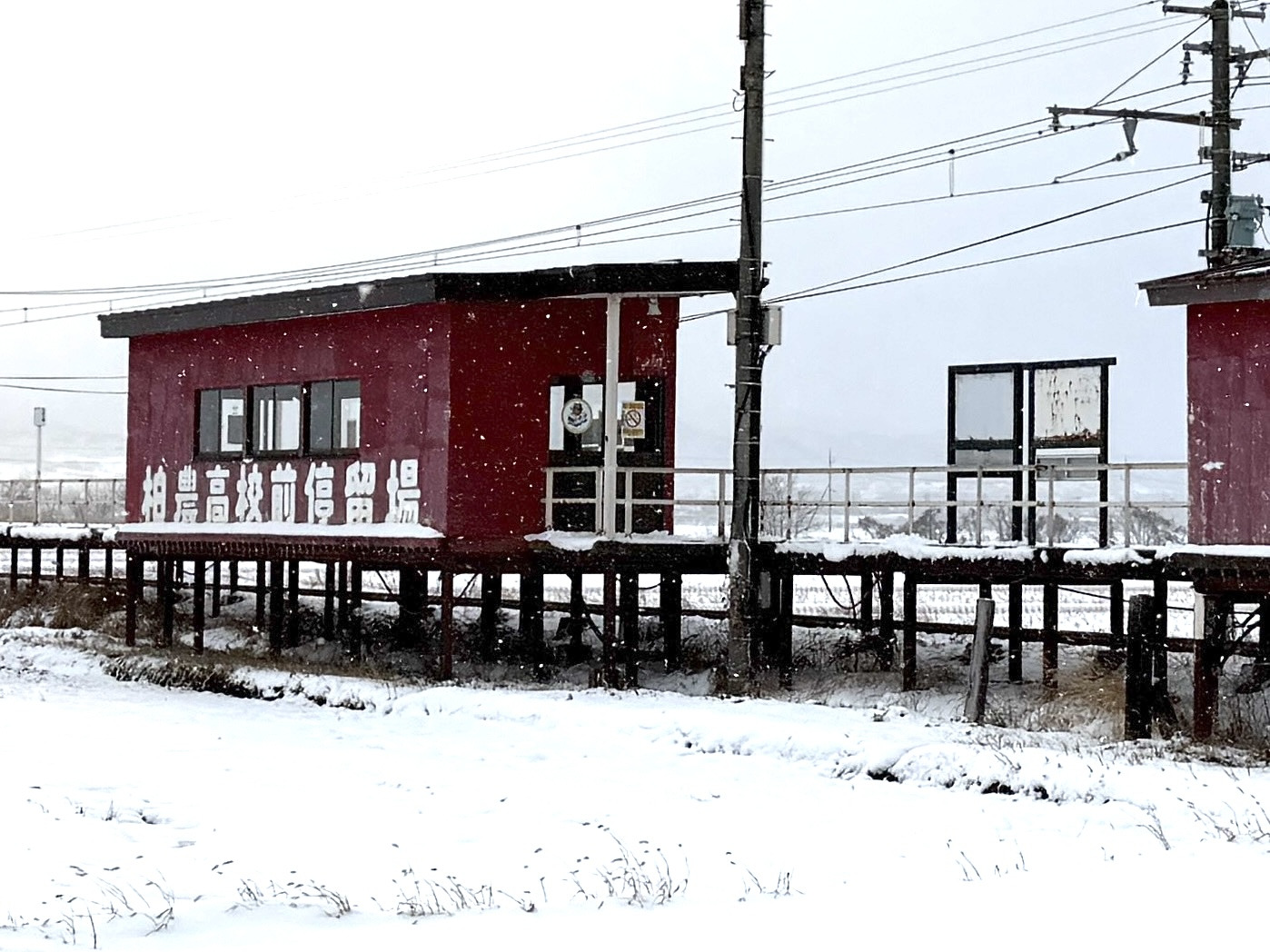 柏農高校前駅 ようやく来た弘南線に乗って、今度は柏農高校前駅で下車。名前の通り、高校がある駅で、制服を着た生徒さん達が入れ違いに乗り込んできました。