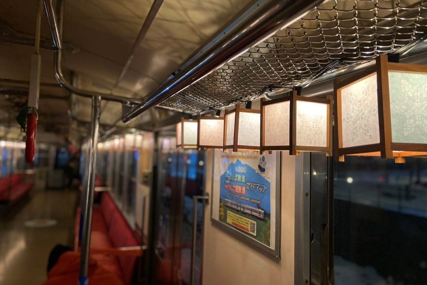 大鰐線「りんごねぷた列車」 さて、ここからようやく列車に乗ります。大鰐線の車両は、「りんごねぷた列車」でした。車内はりんごのねぷたで彩られ、かわいくて華やかです。