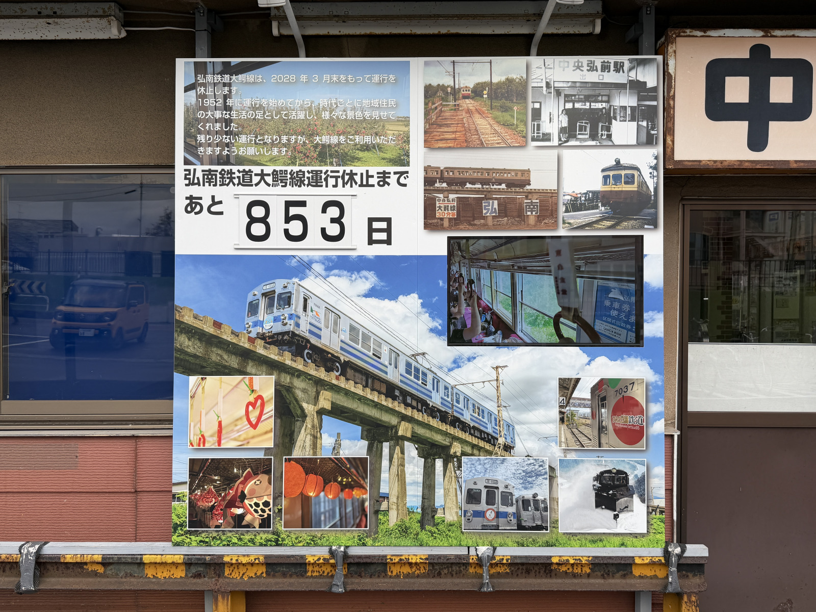 中央弘前駅にあるカウントダウンパネル しかし大鰐線は、2028年3月末で運行休止となることが決定しています。利用者の減少が大きな原因だそうです。私もたまにしか来られませんでしたが、鉄道路線がなくなってしまうのは残念でなりません。