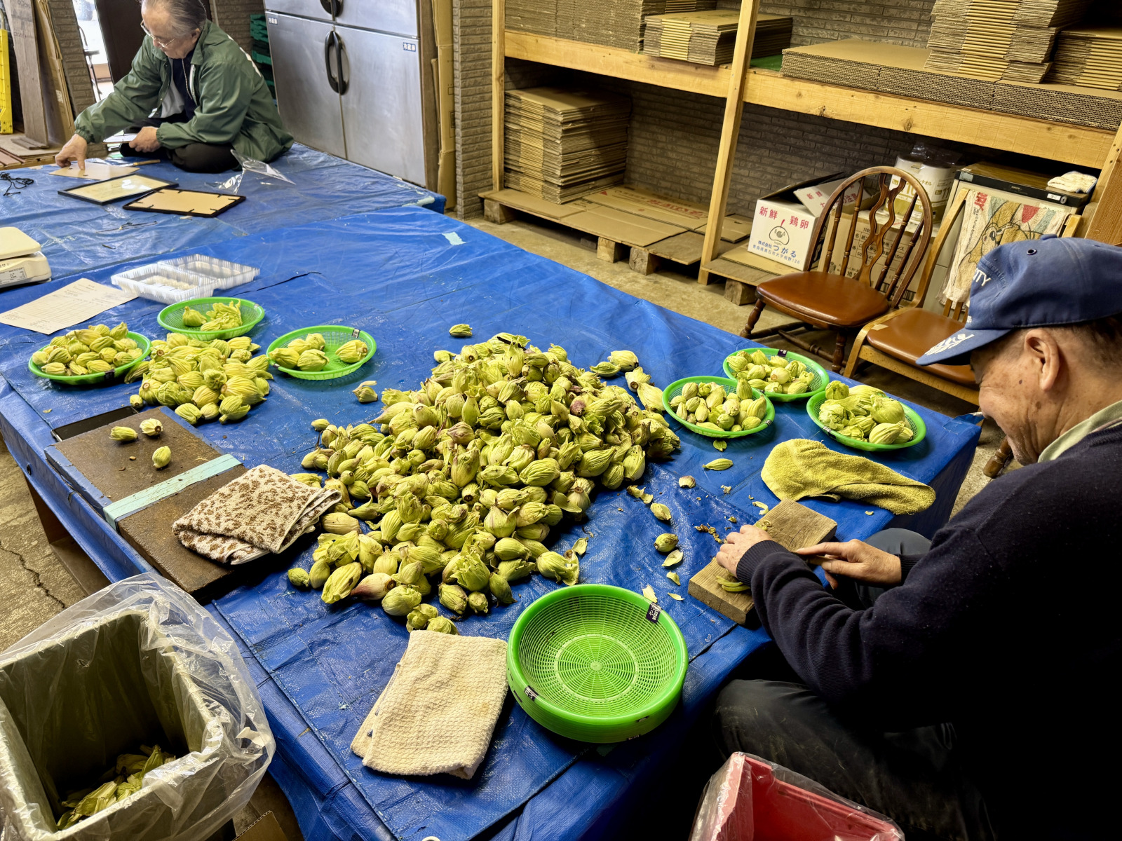 作業場には早春の香りが満ちています。取材した3月初旬のメイン商材であるふきのとうの写真を指し示す、