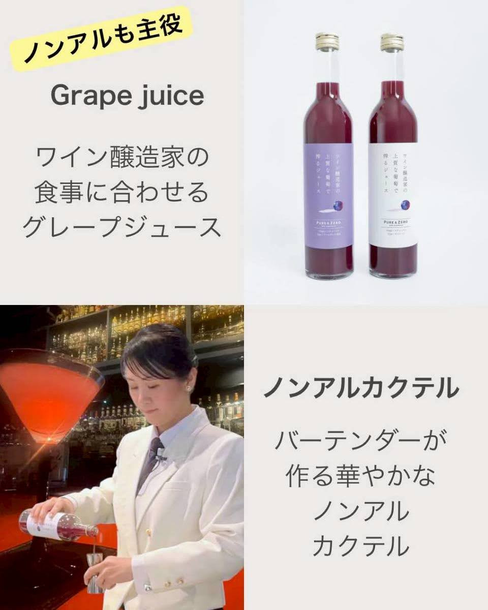 ノンアルもあります!バーテンダーによるノンアルカクテルや、ワイン醸造家が手がけるぶどうジュースもご用意。