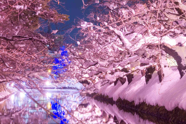 弘前公園の外濠の一部をさくら色にライトアップすることで、桜の樹の枝に積もった雪が照らされ、満開の桜が咲いているかのような風景を楽しめるんです。