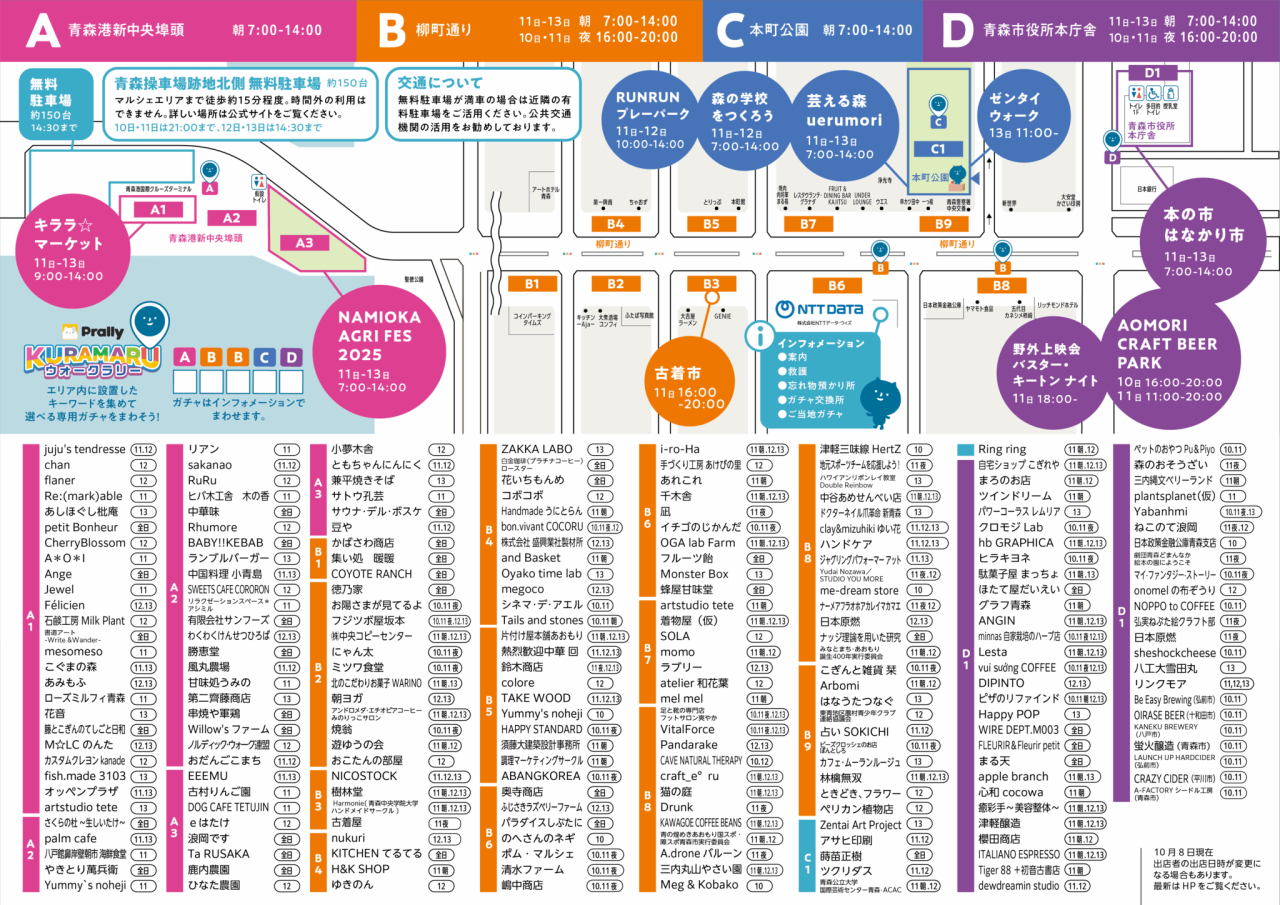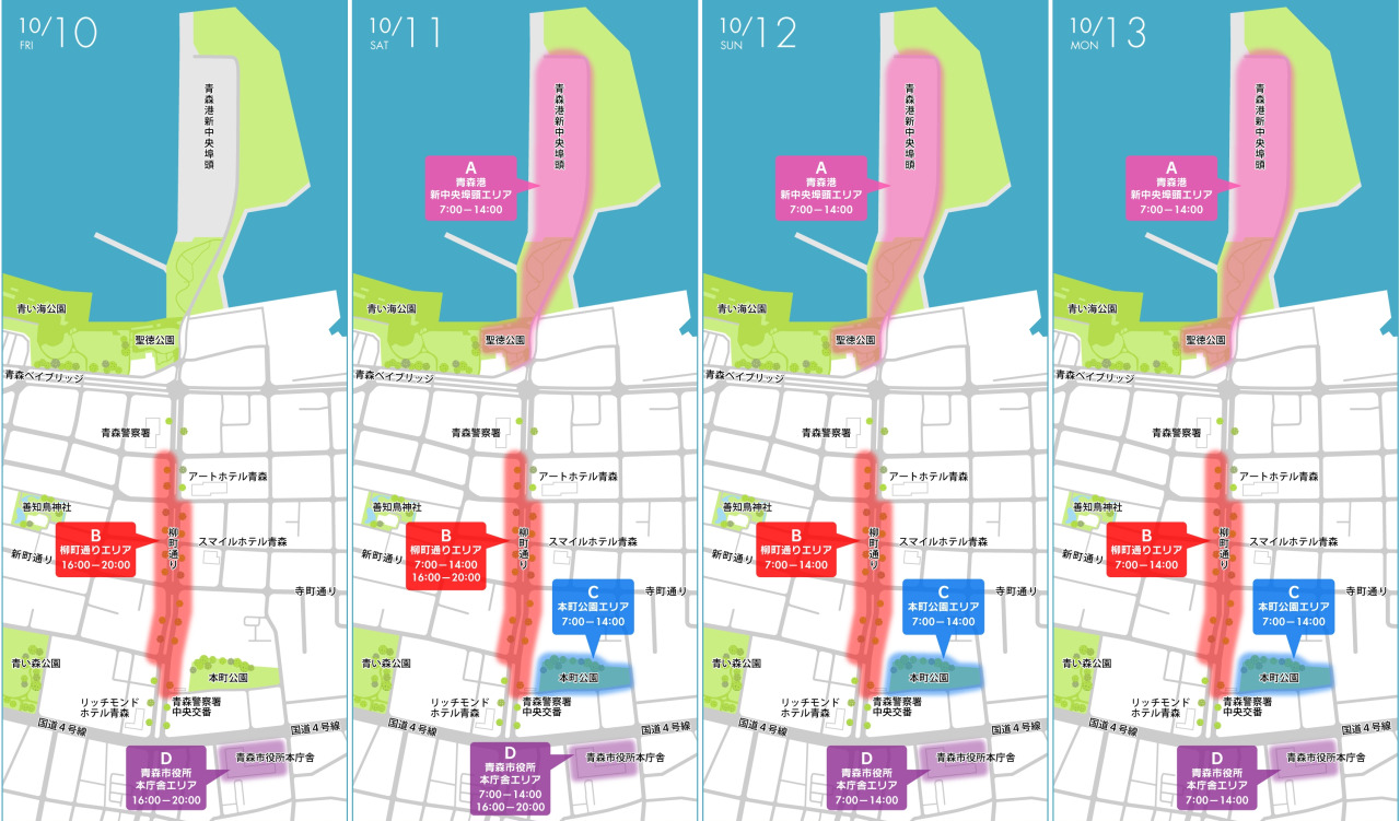 ・11日(土) 7:00〜14:00 (全エリア)・16:00〜20:00 (B 柳町通りエリア、D 青森市役所本庁舎エリア)