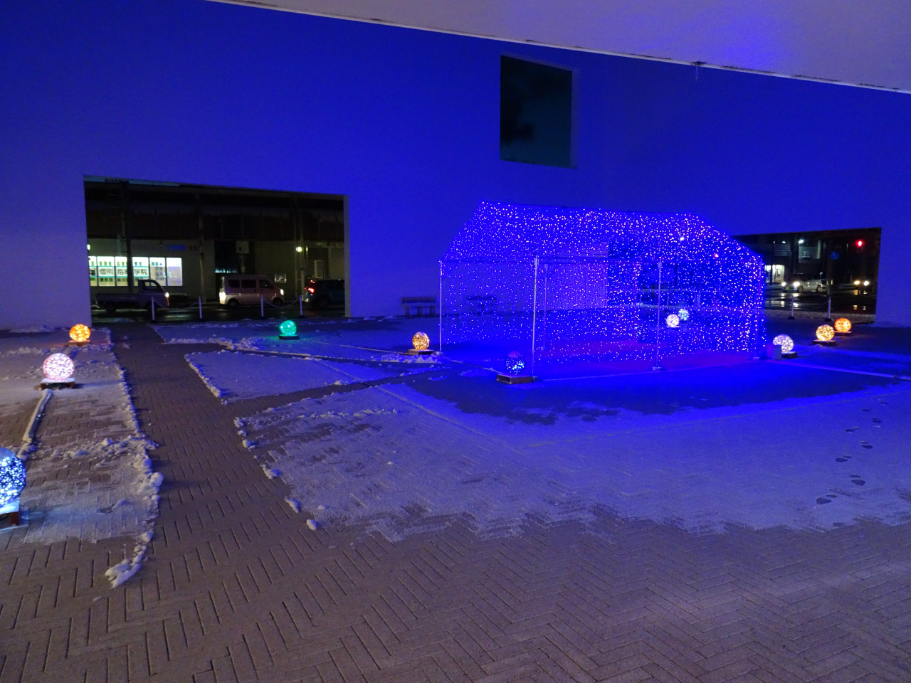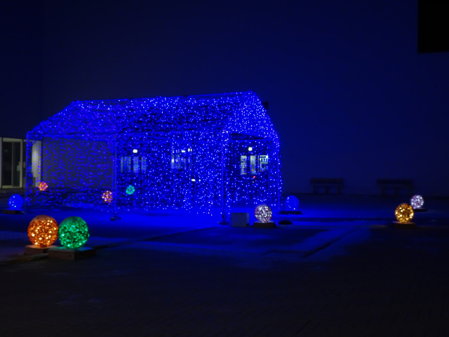 カラフルなオーガニックボールや家の形に装飾された青色イルミネーションが白い壁に反射して輝き、幻想的な空間を演出します。