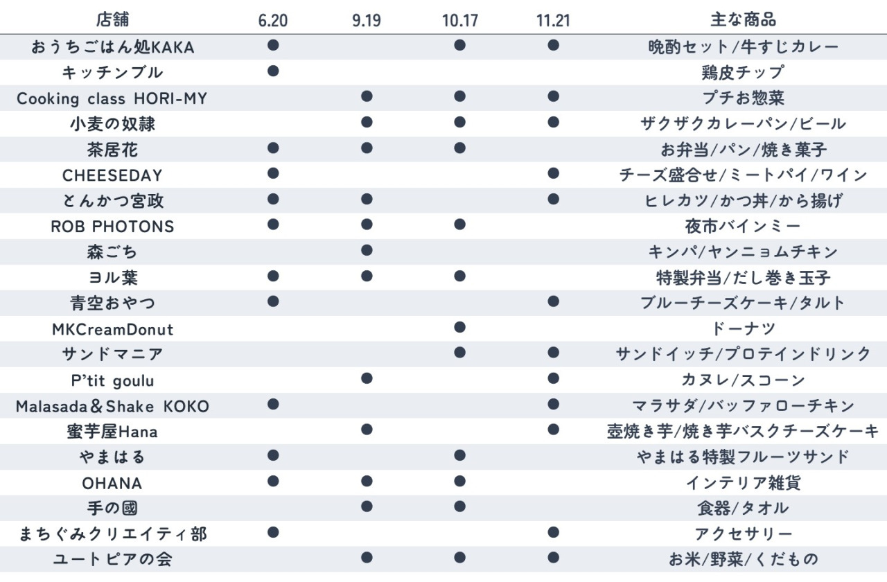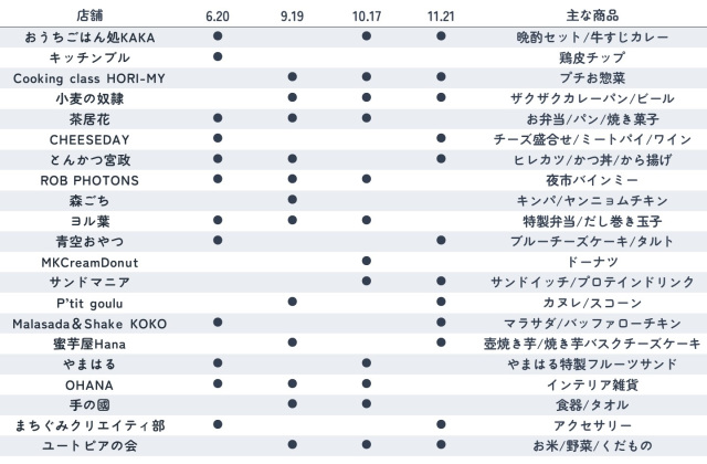 6月から定期的に開催され、各回バラエティに富んだ12店が出店。