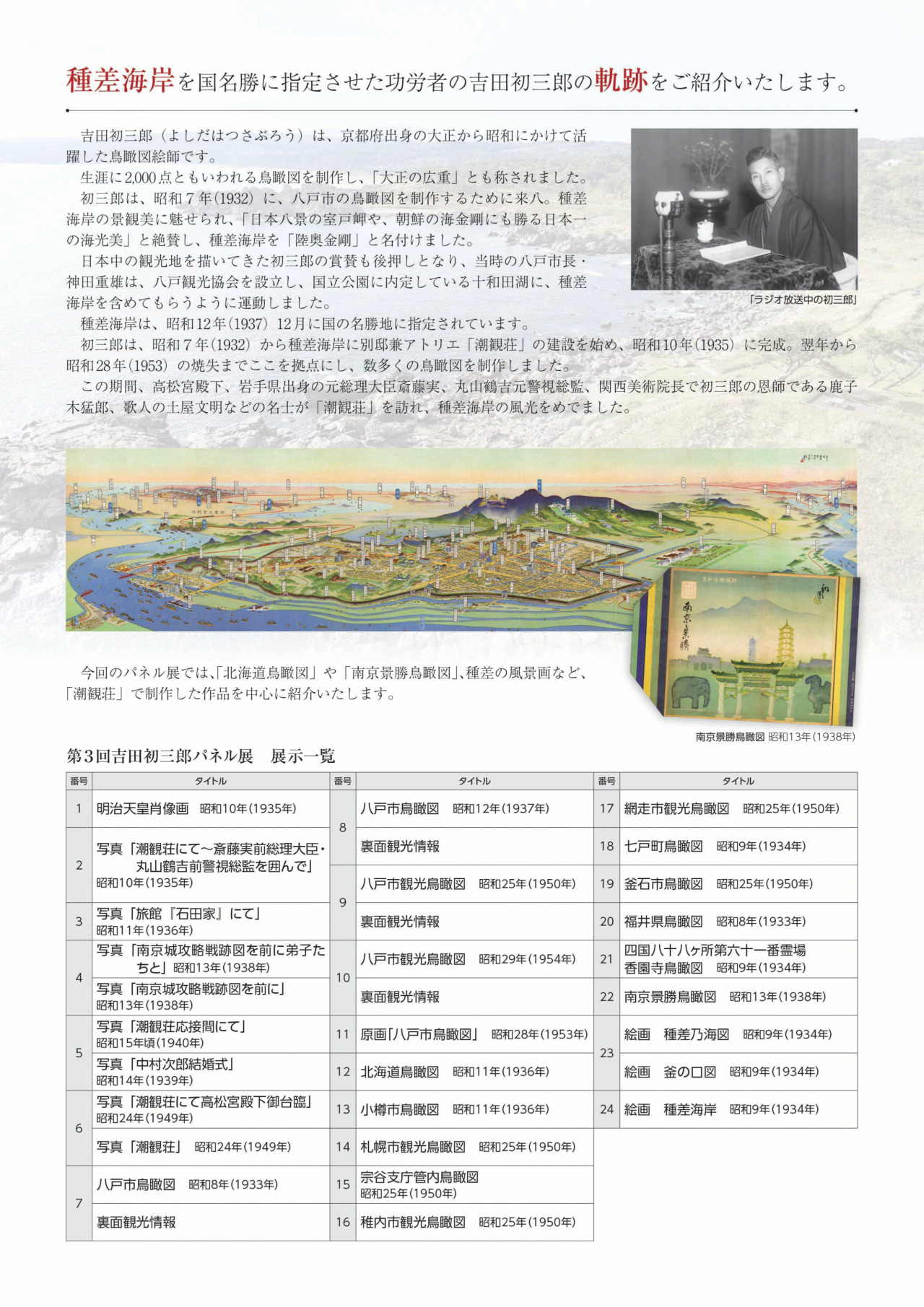 今回のパネル展では、「北海道鳥瞰図」や「南京景勝鳥瞰図」、種差の風景画など、「潮観荘」で制作した作品を中心に紹介します。