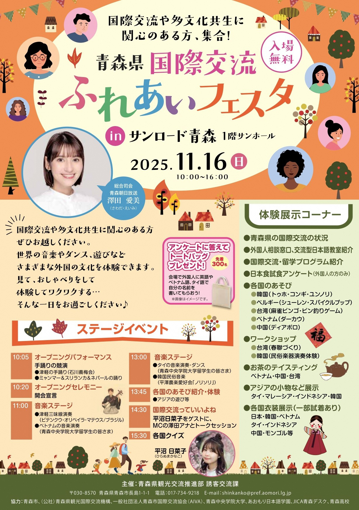 11月16日(日)10:00~16:00まで、サンロード青森サンホールにて、「青森県国際交流ふれあいフェスタ」を開催します。