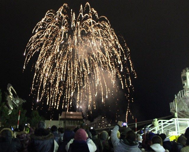 その直後には、色鮮やかなニューイヤー打上花火が冬の澄んだ夜空を美しく染め上げます。