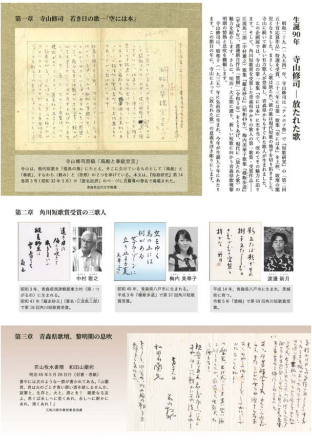 会場では、現代短歌について論じた直筆原稿「風船と拳銃宣言」や関連資料などを展示し、寺山の短歌がどのように新しい表現を切り拓いたのかを紹介しています。