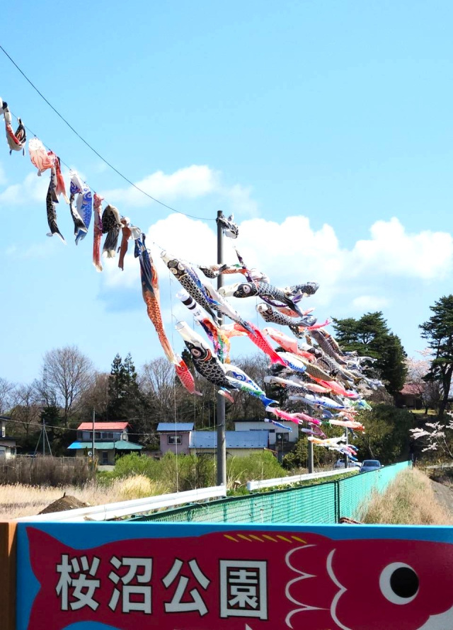 五戸町上市川地区の桜沼公園では、端午の節句の時期にあわせて鯉のぼりが掲揚されます。
