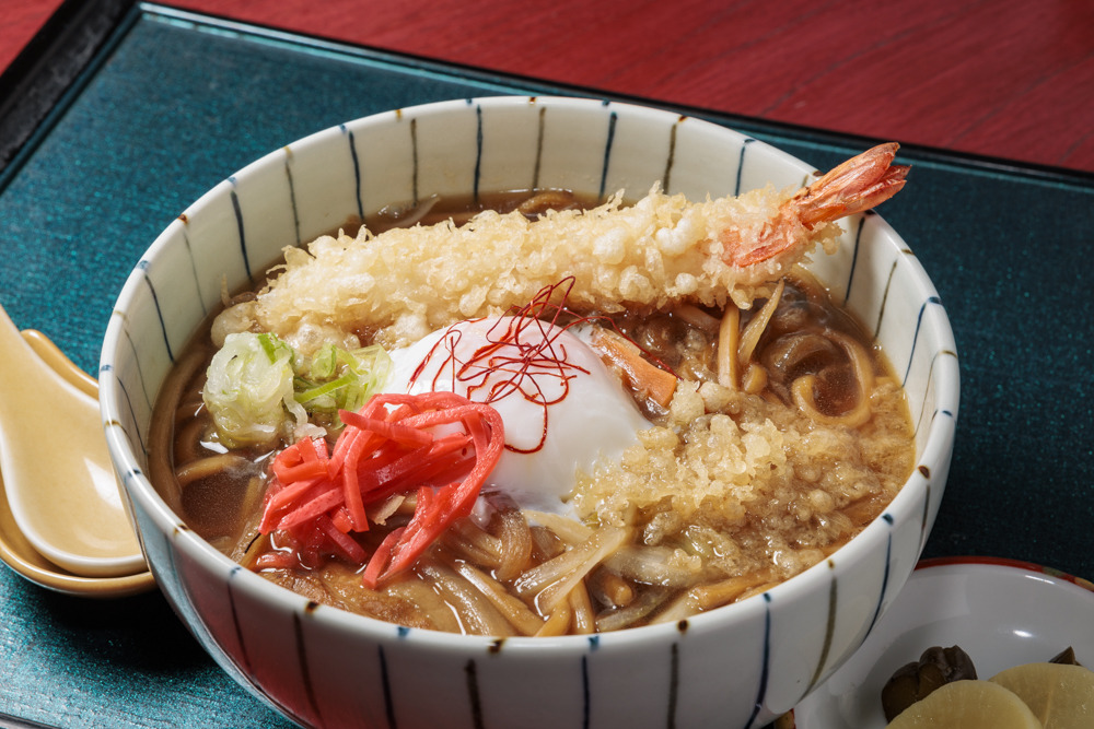 寺山餅店のすぐ隣にある「和風レストラン御幸」では、黒石のソウルフード「つゆ焼きそば」が味わえます。温かいそばつゆにソース焼きそばが浸ったつゆ焼きそば。御幸のつゆ焼きそばは温泉卵と大きな海老天が乗っていて、ボリュームも満点です。ほかにも、津軽の食材をたっぷりと使ったメニューが豊富ですよ。