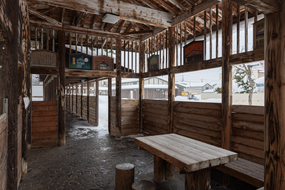 青森県のほぼ中央に位置し、津軽平野に囲まれる黒石市。津軽地方のローカル線線である弘南鉄道弘南線・黒石駅から徒歩10分の場所に、「日本の道百選」に選ばれ、国の重要伝統的建造物群保護地区に指定されている「中町こみせ通り」があります。