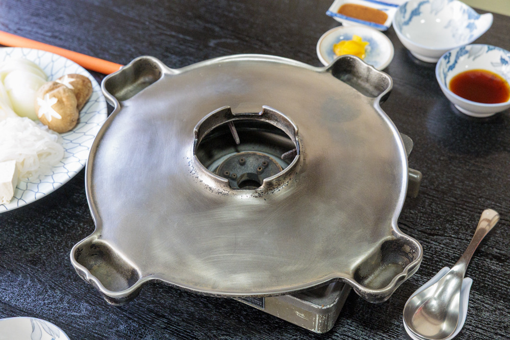 さっそく義経鍋の登場です。見たことのない変わった形状の鉄板。この中央には、水炊きのための小鍋が乗ります。義経鍋とは、小鍋の周りの鉄板で馬肉を焼き、中央の小鍋では水炊きも楽しめる、1つの鍋で2つの食べ方が味わえる料理なのです。