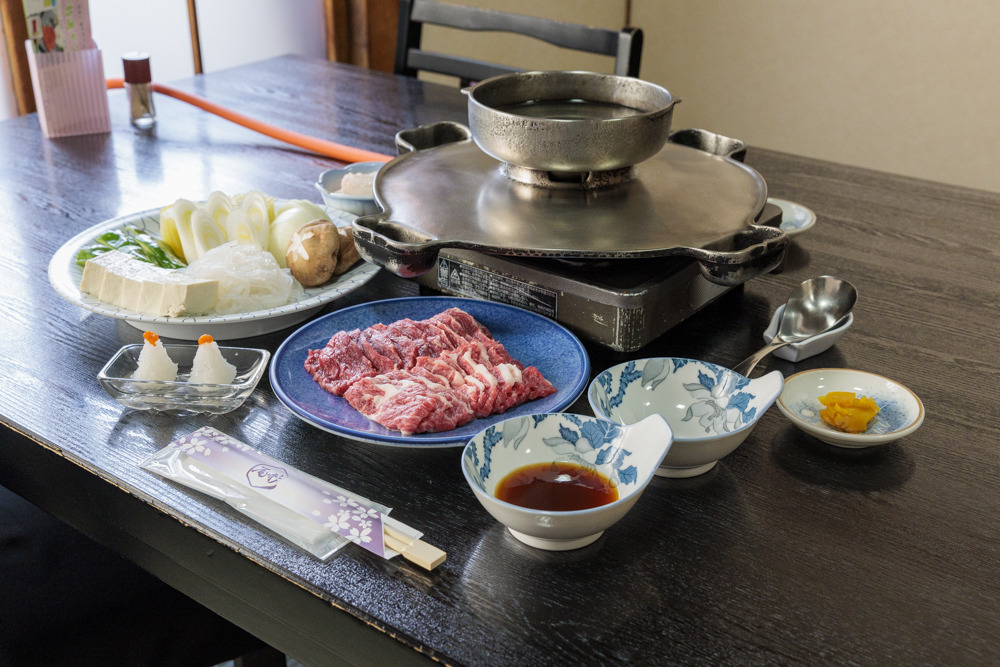 中央の小鍋にはこんぶ出汁の入ったスープ、そして鍋に入れる具材と、焼き肉用の野菜、たっぷりの馬肉が運ばれてきました。