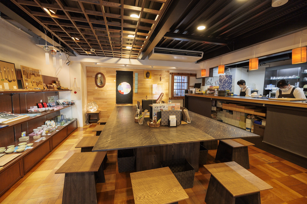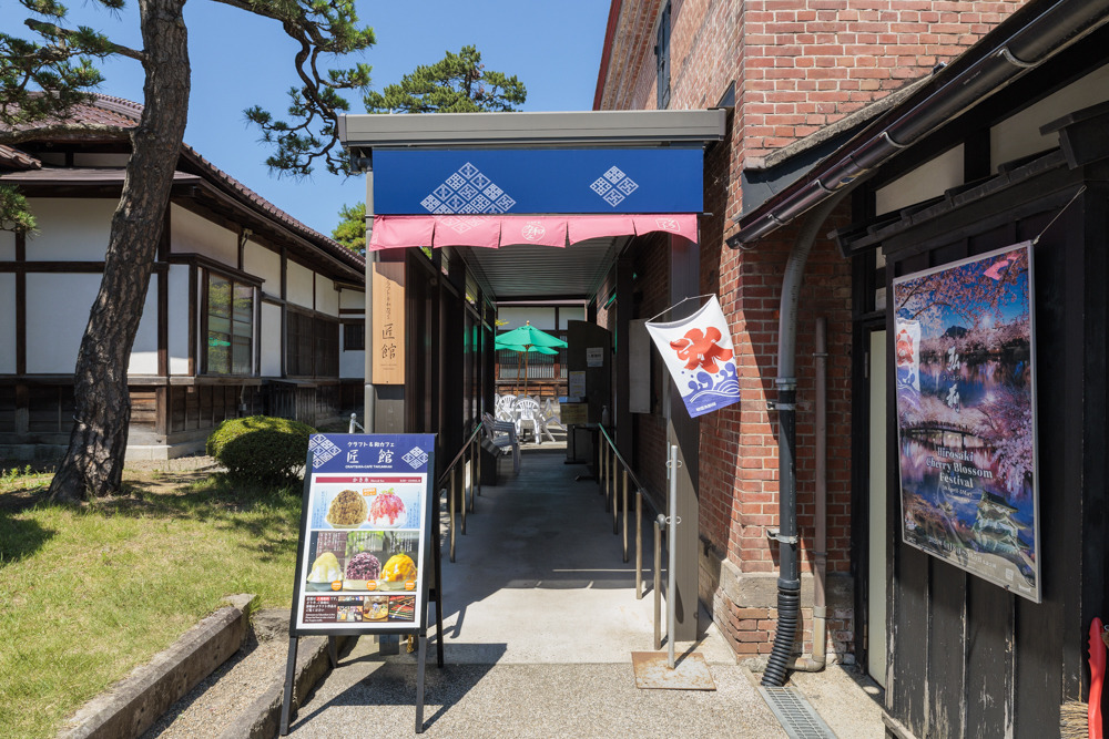 庭園の門を入って右手にある匠館は、レンガ造りの倉庫のような外観の趣ある建物。カフェ内で津軽塗やこぎん刺しなど津軽に息づく伝統工芸品を展示販売しており、伝統工芸品と和のスイーツが両方楽しめる人気スポットです。