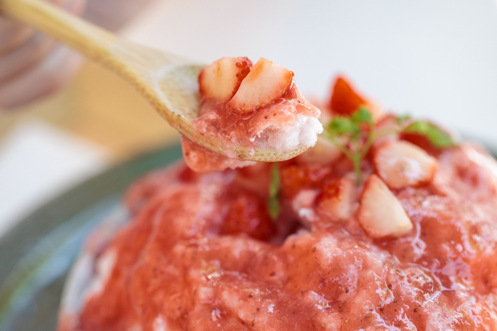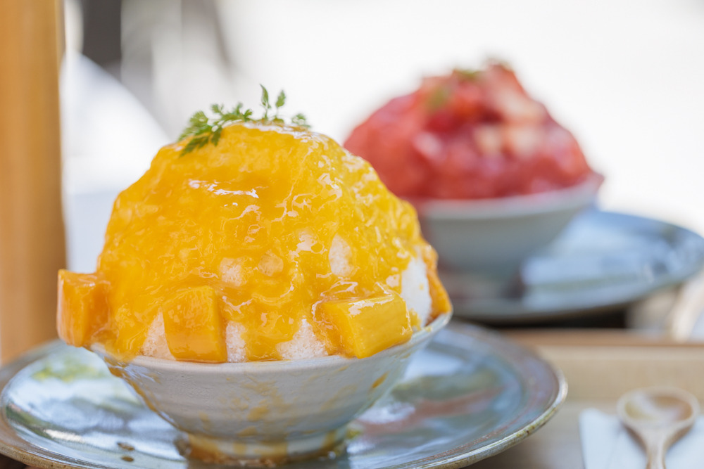 夏いちごみるく氷は、弘前市の岩木山の麓にある「いわきとそら農園」で栽培された夏いちごをシロップにしており、いちごの果肉もたっぷり。マンゴー杏仁みるく氷は、食べ進めるとたっぷりの杏仁豆腐が底に沈んでいて、濃厚なマンゴーソースと絡めると絶品です。