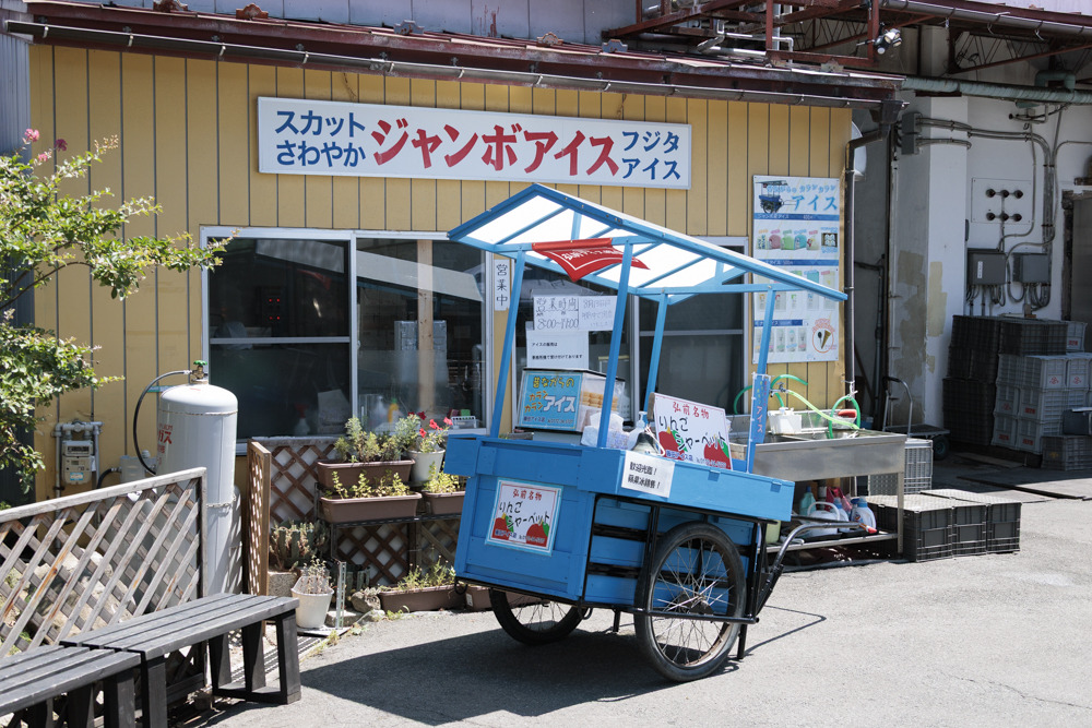 弘前公園の東門前には、藤田アイス店が手掛ける「りんごシャーベット」を販売するアイス屋さんがいます。りんごの産地で観光客も多い弘前公園の周辺ではりんごシャーベットや昔なつかしのバナナ風味のシャーベットアイスを販売するアイス屋さんが多いそうです。