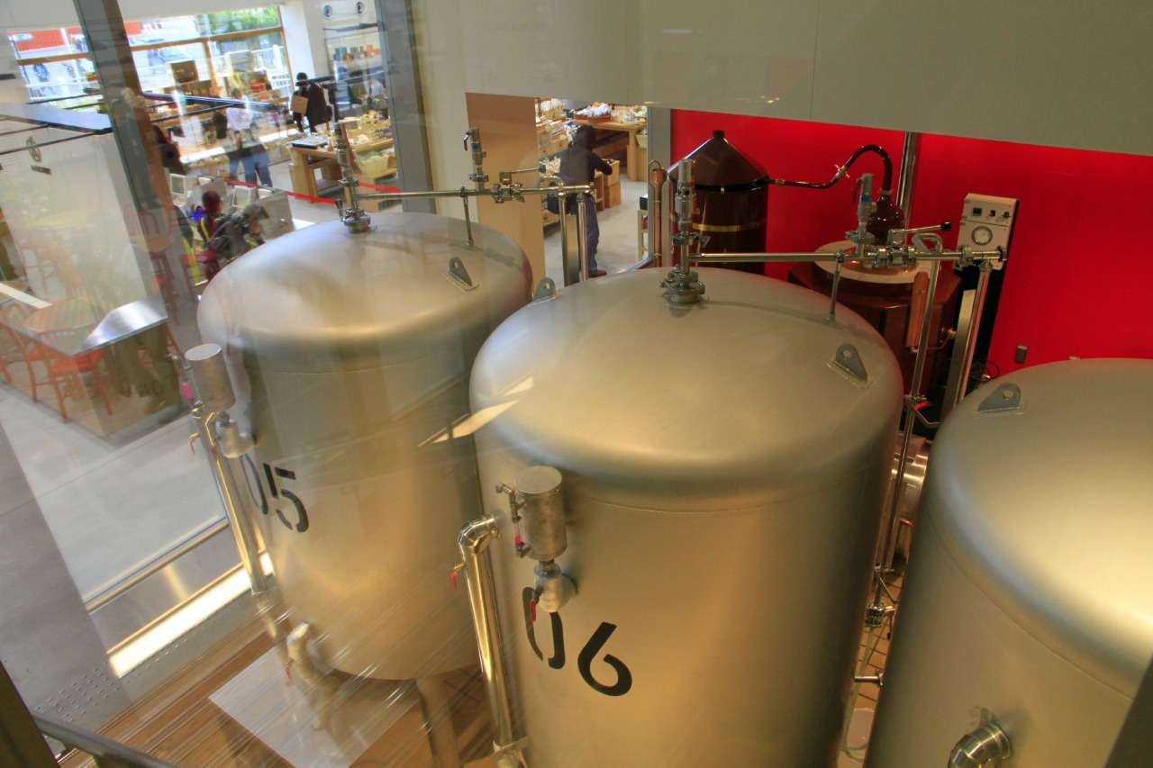 フードマルシェを奥に進んでいくと、銀色のタンクが並ぶシードル工房が。