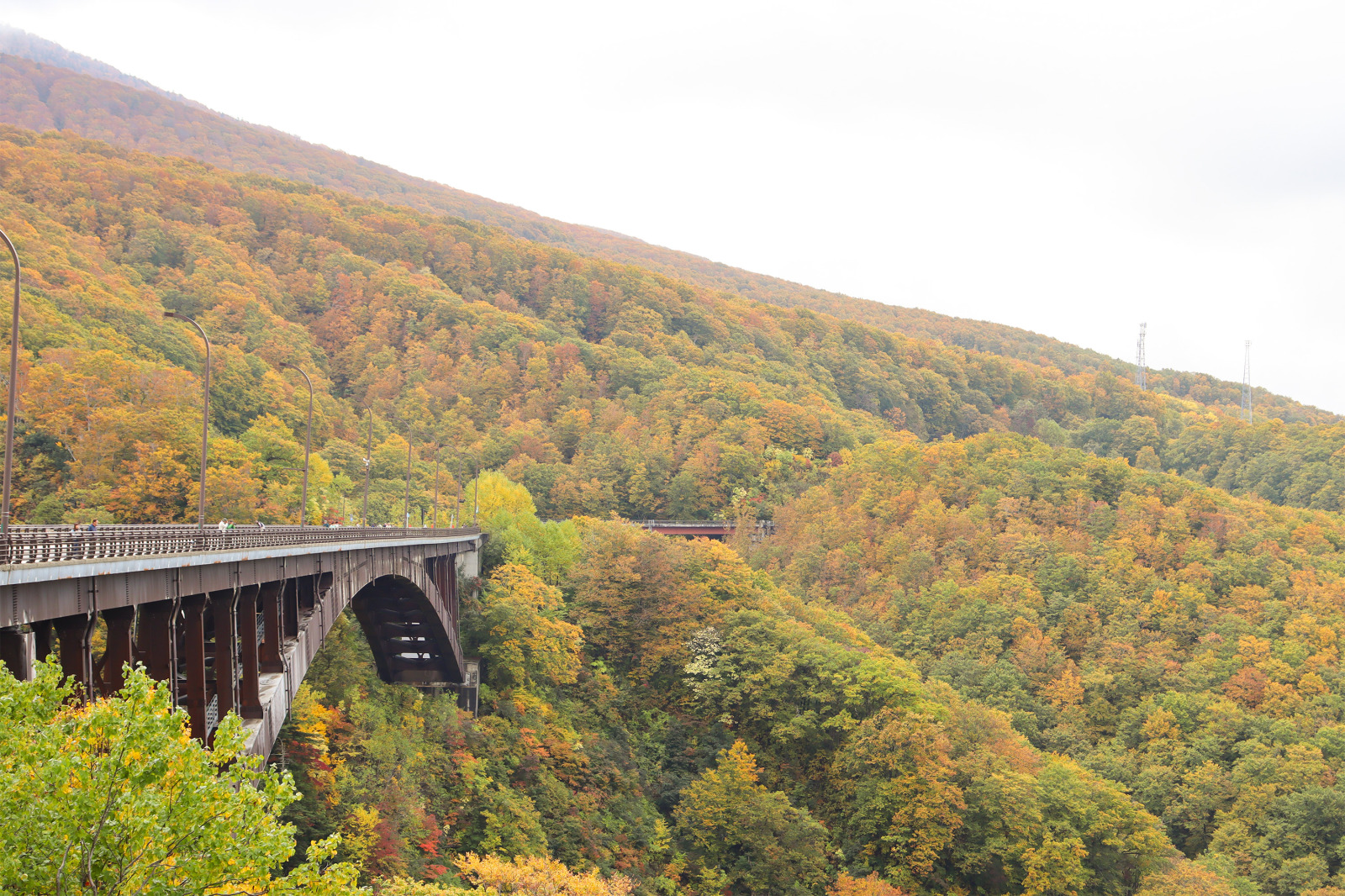 紅葉のピーク時には山一面が赤・橙・黄に染まり、橋上からの眺めは圧巻。全身で秋の雰囲気を感じることができます。