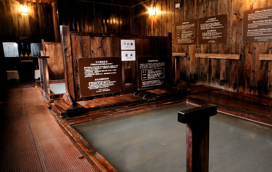 木造の湯屋には「上の湯」と「下の湯」の二つの源泉があり、体をじっくり温めるぬる湯が特に人気。