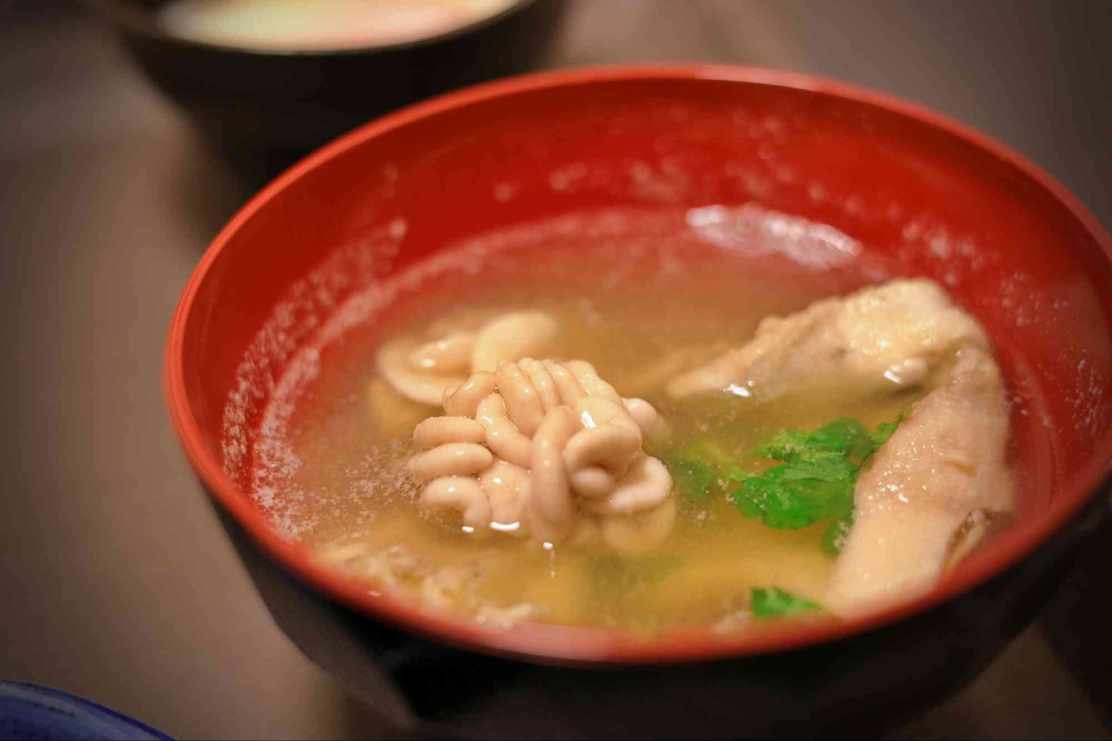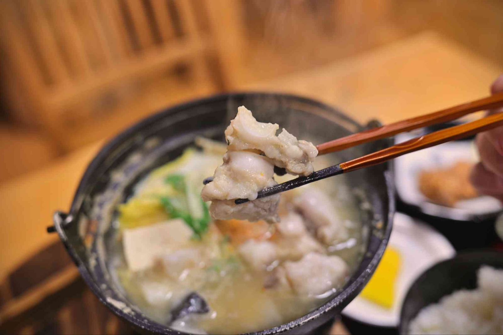 調理の仕上げに肝を溶かし、白子を入れると、スープに深いコクと旨みが広がります。