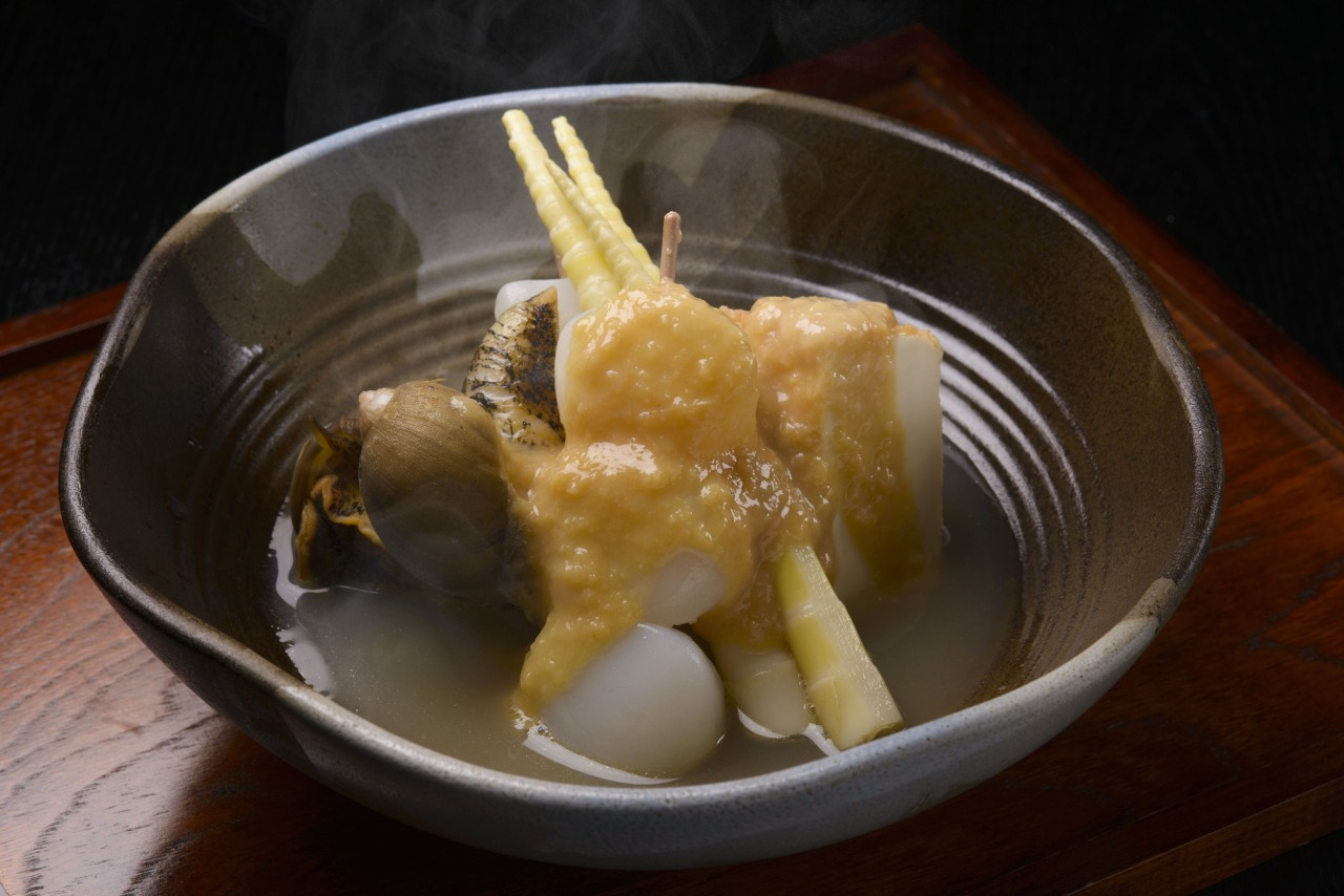 大きな鍋でぐつぐつと煮込まれ、じんわり温まる生姜味噌で味わうおでんは、寒い時期に味わいたい一品。
