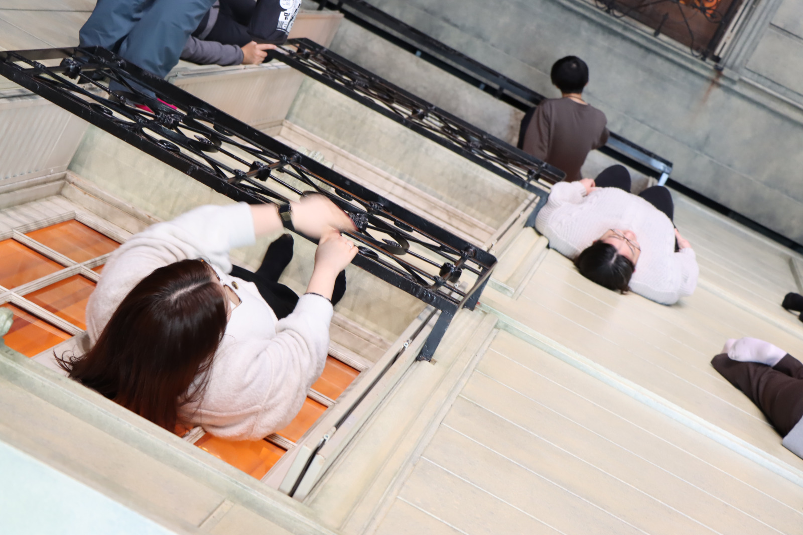 この作品は、床と水平に置かれたヨーロッパ風の建物の外観の上でポーズをとることで、斜めに立ち上がる大きな鏡に重力から解き放たれたような光景が映し出されるというもの。
