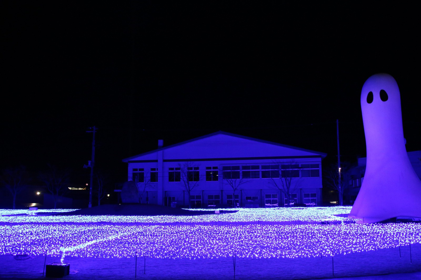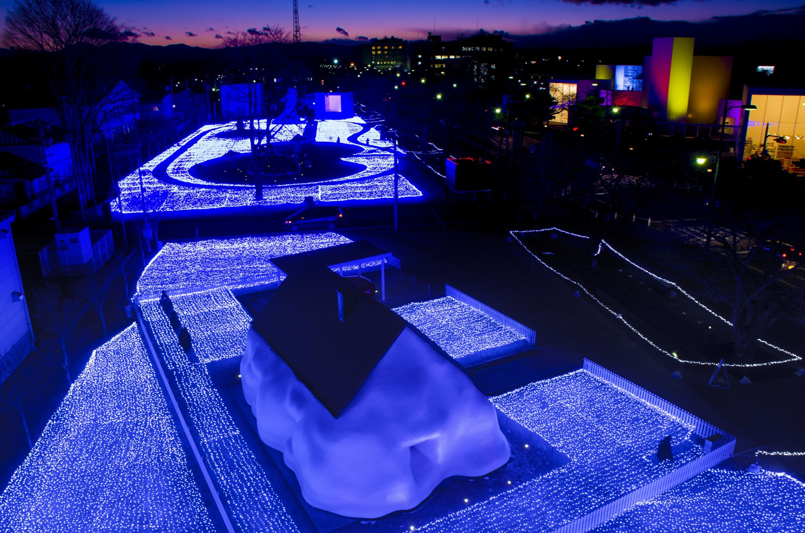 雪夜に青く浮かび上がる現代アートの魅力をぜひご堪能ください。