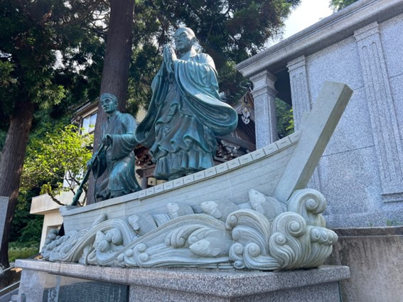 入り口には、鎌倉時代の僧・日持上人と船頭の蠣崎甚兵衛の銅像があります。