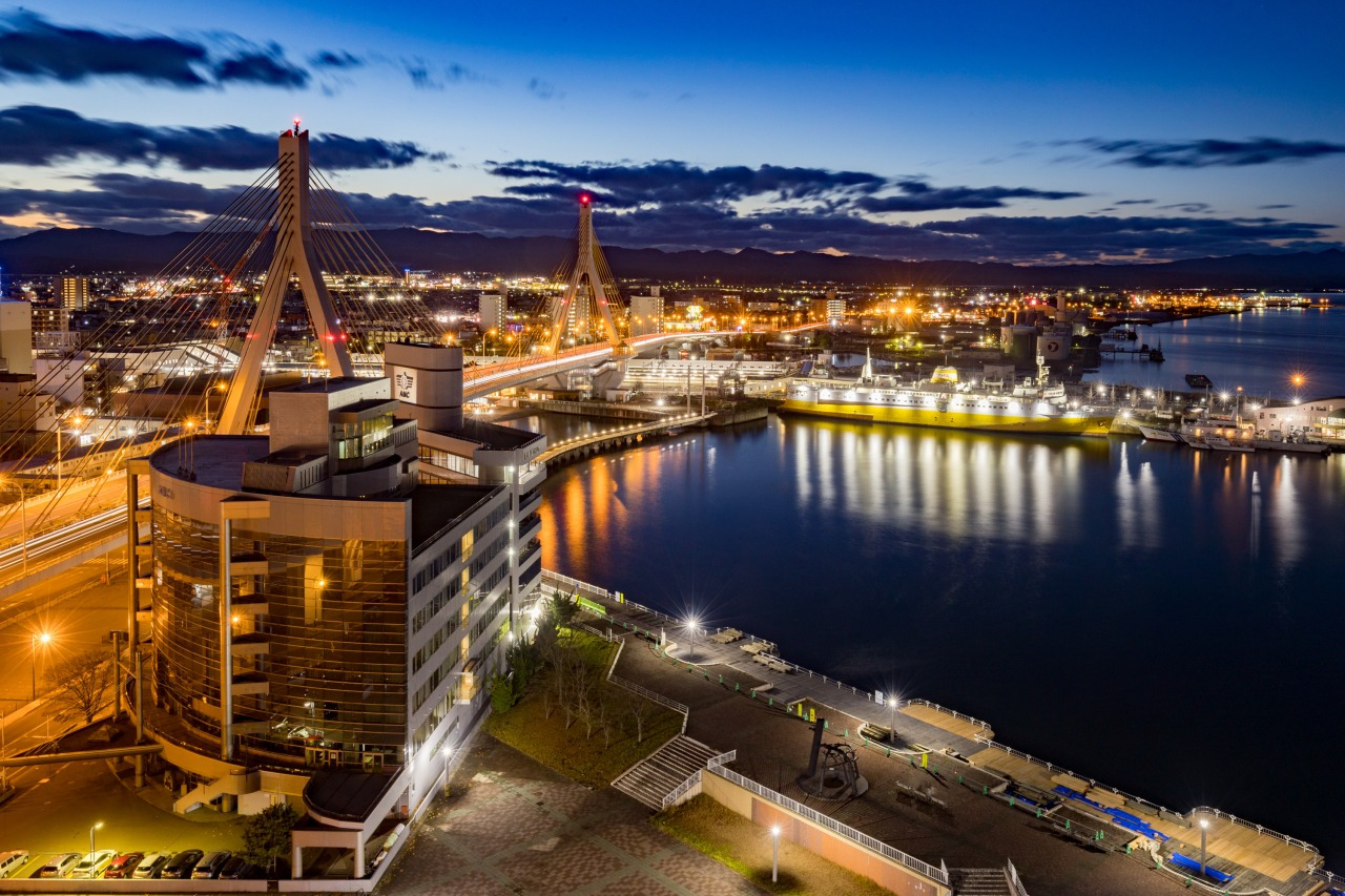 青森駅前のウォーターフロントエリア、陸奥湾をバックに六連の三角屋根が並ぶ「A-FACTORY(エーファクトリー)」。2011年度にグッドデザイン賞を受賞した建物は、青森ベイブリッジとのコラボレーションが美しく、夜のライトアップ時には幻想的な景観を作り出します。