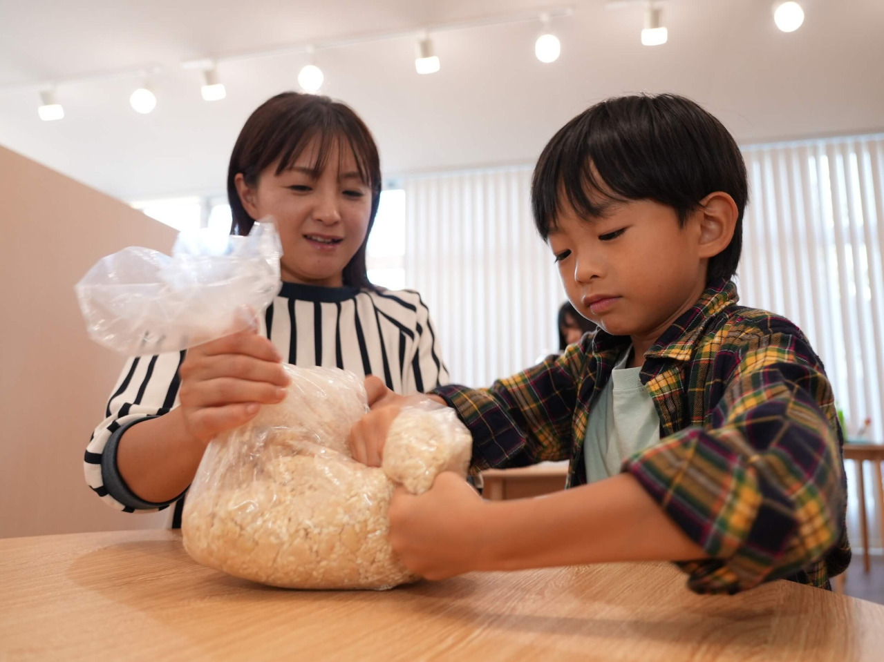 蒸した大豆をつぶして、米糀と塩などを混ぜ合わせて約1.5㎏のみそを仕込む「みそ仕込み体験」は、大人の子どもも一緒に楽しむことができます。