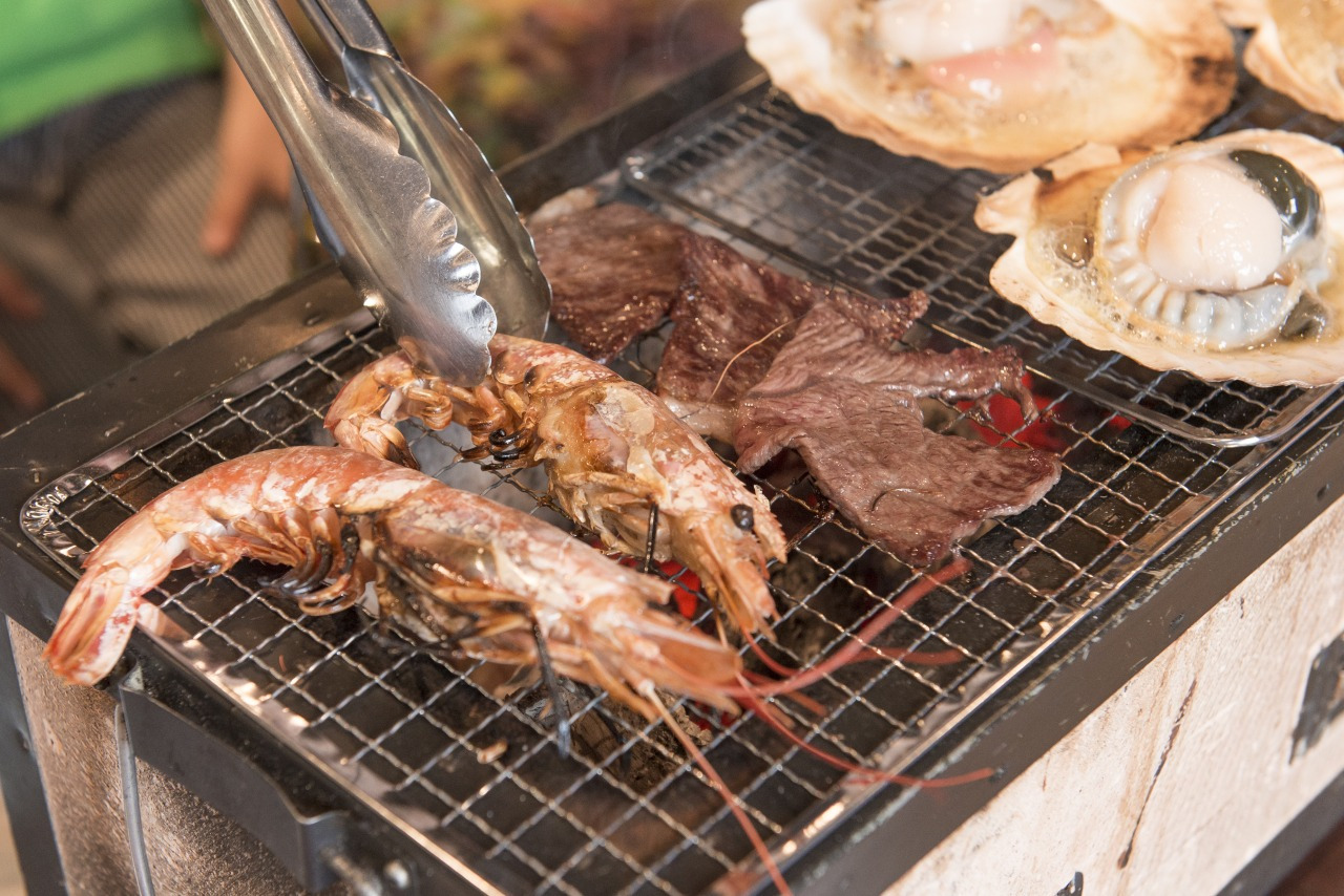 近海で獲れた魚介類を使った磯料理や郷土料理が味わえる「厨スタジアム」や、八戸の食をまるごと味わえる「味横丁」があります。購入した魚介類や肉をその場で炭火焼きできる「七厘村」は大人気!牡蠣もホヤもイカも新鮮で、感動の美味しさです。名物のせんべい汁やりんごジュースも味うことができます。