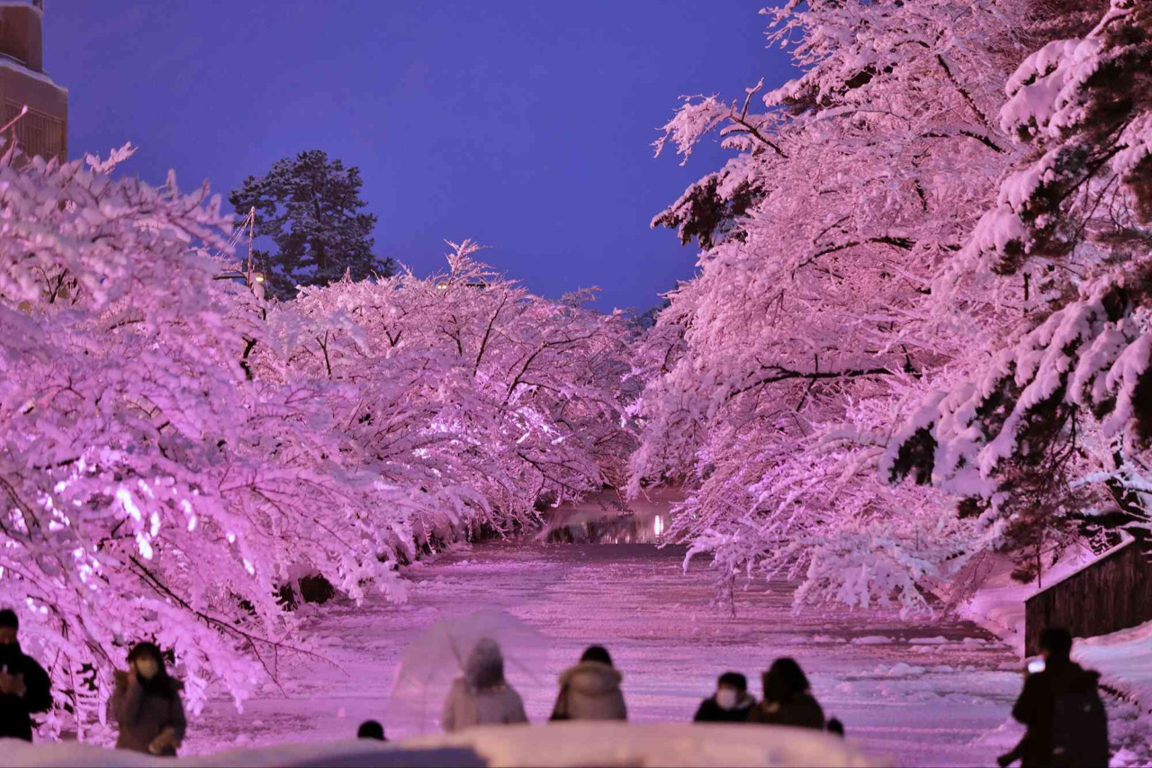 弘前公園の外濠の一部をさくら色にライトアップすることで、桜の樹の枝に積もった雪が照らされ、満開の桜が咲いているかのような風景を楽しめるんです。