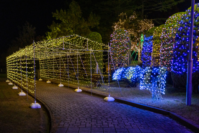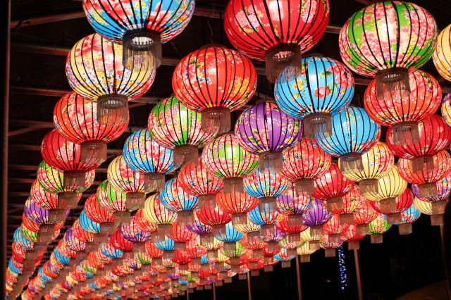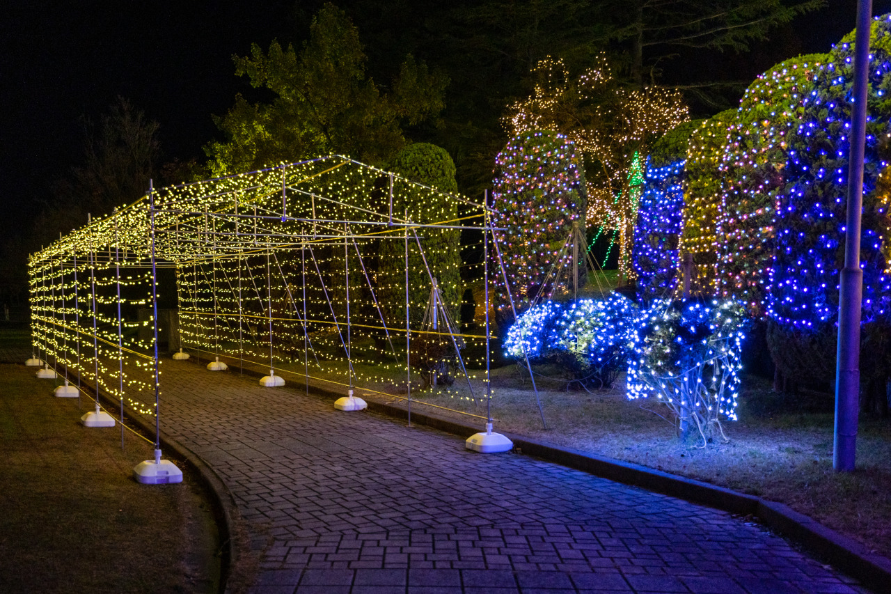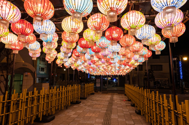 약 10만 개의 LED 라이트와 7가지 색의 선명한 대만식 등롱이 쓰가루의 겨울을 아름답게 수놓는 ‘히라카와 일루미네이션 프롬나드’.