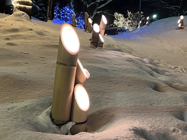 히라카와시 중앙 공원에서는 LED 일루미네이션과 더불어 대나무로 만든 촛불이 공원 산책로를 밝히고 있습니다.