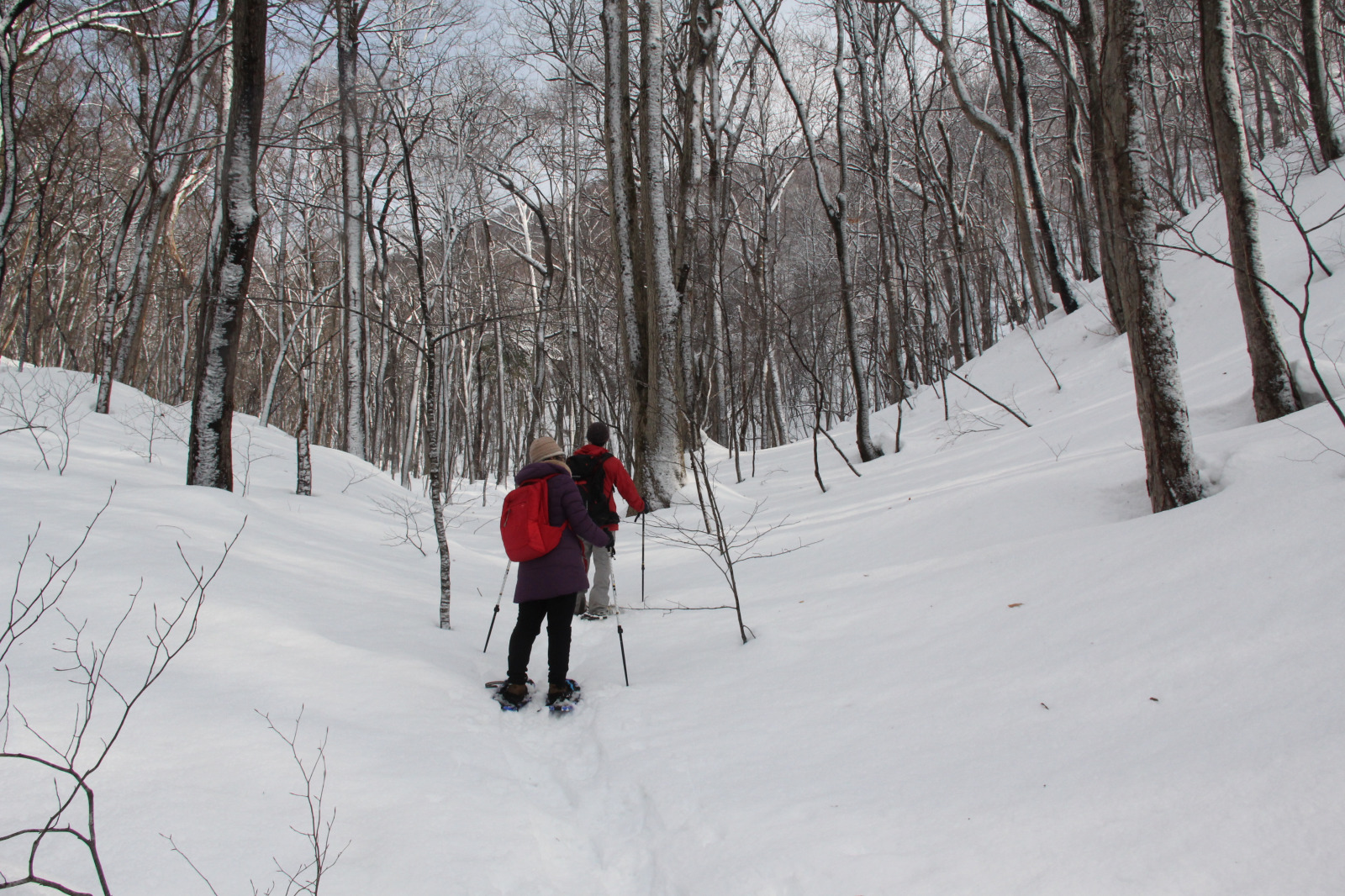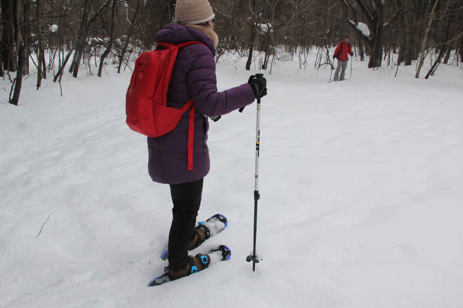 장비를 꼼꼼히 착용하고 걷는 방법을 배웠다. 처음에는 요령이 없어 방향을 틀다가 중심을 잃고 넘어지기도 했다. 그러나 코스 중반에 접어들자 스틱과 스노슈즈에 점차 익숙해지며 제법 박자에 맞춰 걸을 수 있게 되었다. 참고로 눈 위로 넘어지기 때문에 전혀 아프지 않다. 가이드는 오히려 “얼마든지 넘어지셔도 좋다”라고 웃어 보였다. 걷는 도중, 가이드는 스틱으로 한쪽을 가리키며 동물 발자국에 대해 설명해 주었다. 토끼, 여우, 오소리 등 다양한 생명들이 이 산속에서 겨울을 나고 있었다. 식물 역시 조용히 저마다의 방식으로 계절을 견디고 있었다. 특히 인상 깊었던 것은 ‘엽흔(葉痕)’이었다. 잎이 떨어진 뒤 줄기에 남은 흔적의 모양인데, 마치 웃는 얼굴처럼 보여, 다음 해에도 힘내라는 메시지인 것 같아 나도 모르게 미소가 번졌다.