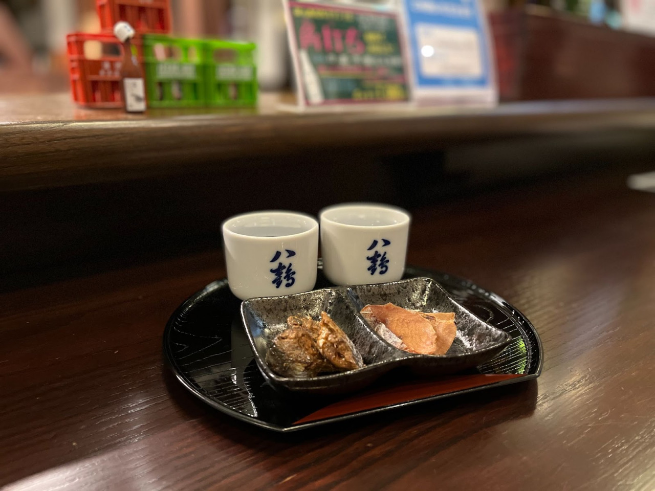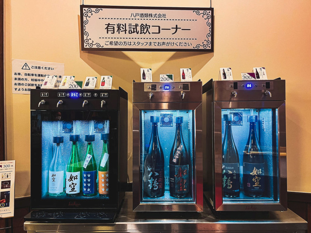 매장 내부는 목재를 바탕으로 한 차분한 분위기이며, 대표 브랜드인 ‘하치즈루(八鶴)’와 품평회에서 금상을 수상한 ‘죠쿠(如空)’를 비롯해 하치노헤 주류(주)가 자랑하는 다양한 명주가 판매되고 있습니다. 그뿐만 아니라 브랜드에 따라서 200엔 또는 300엔 정도의 부담 없는 가격으로 시음해 볼 수 있습니다. 여러 가지 종류의 브랜드를 시음해 볼 수 있기 때문에 맛을 비교하며 취향에 맞는 일본주를 찾으실 수 있습니다. 또한 매장 내에 서서 마시는 공간에서는 가벼운 안주가 포함된 일본주 세트를 즐길 수 있습니다.
