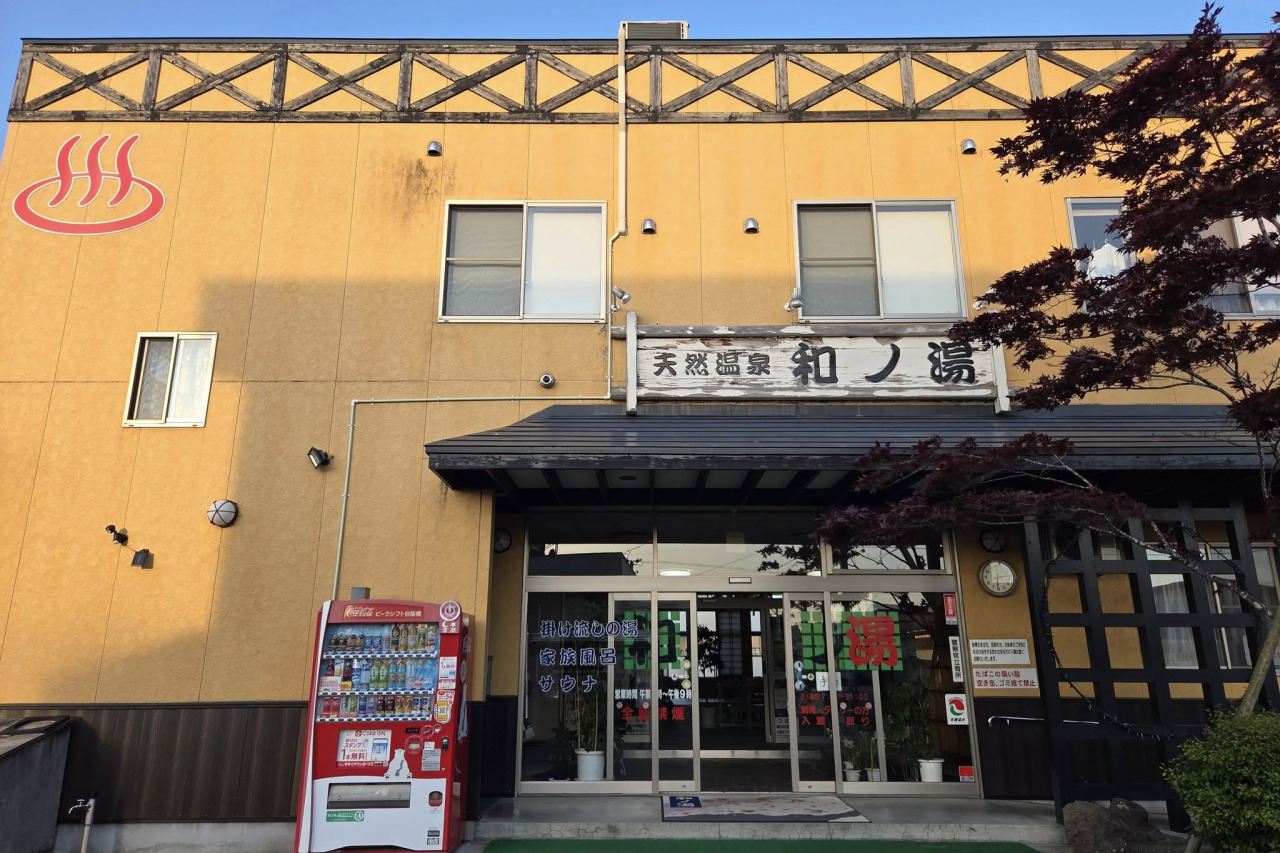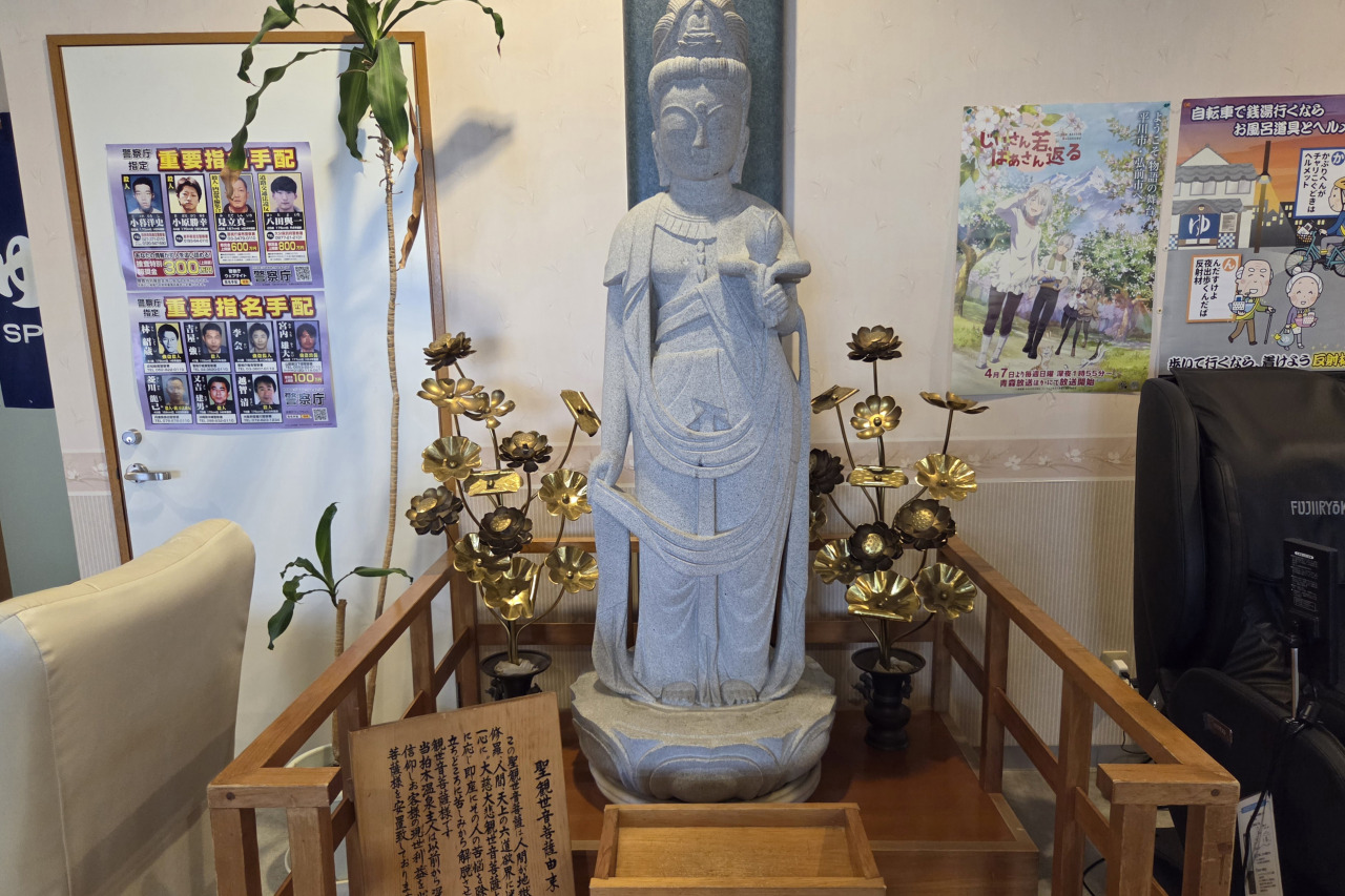 オレンジとクリーム色の外観が目印の柏木温泉。館内に入ると聖観音菩薩がお出迎えしてくれます。