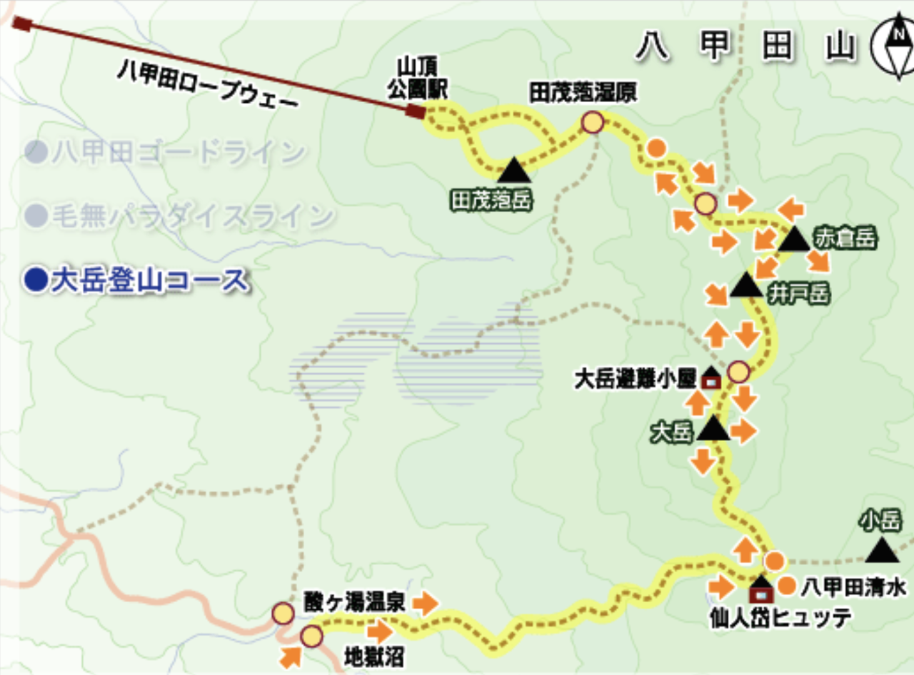 山頂公園駅 ⇒ 赤倉岳(約70分) ⇒ 井戸岳(約20分) ⇒ 大岳避難小屋(約30分) ⇒ 大岳(約60分) ⇒ 大岳避難小屋(約40分) ⇒ 上毛無岱(約40分) ⇒ 下毛無岱(約20分) ⇒ 酸ヶ湯(約80分)