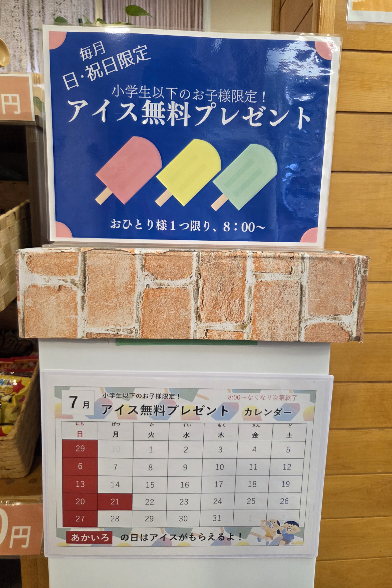 日曜日・祝日は小学生以下のお子様限定で、8時~なくなり次第終了でアイス無料プレゼントがあります。