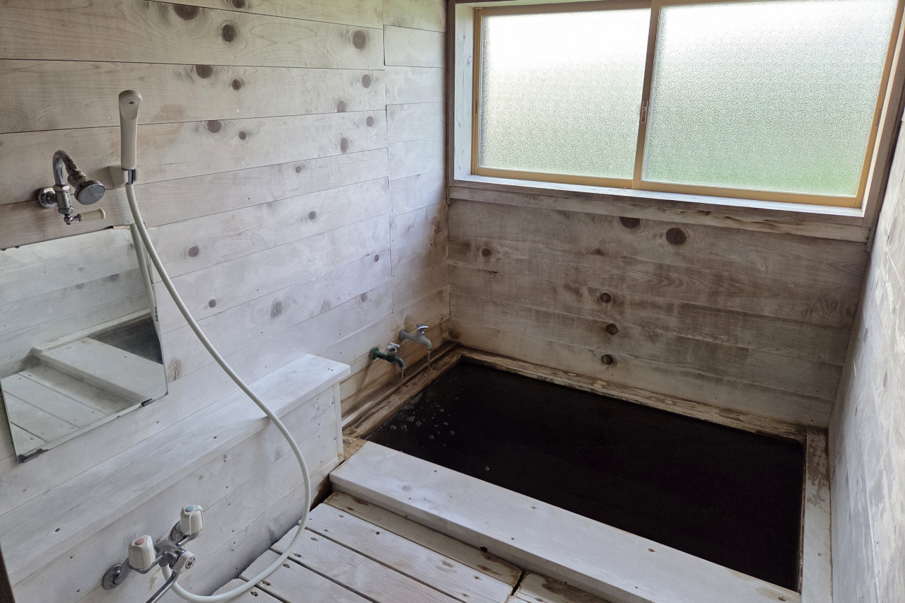 家族風呂はヒノキの浴槽でシャワーやカランも温泉を利用。