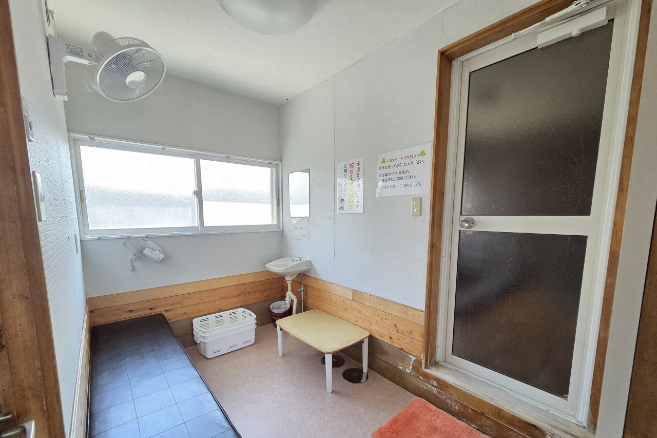 大浴場と家族風呂は建物が分かれているので、家族風呂利用の方は、右側の建物の大浴場受付でお支払いしてから左手の建物の家族風呂へ。