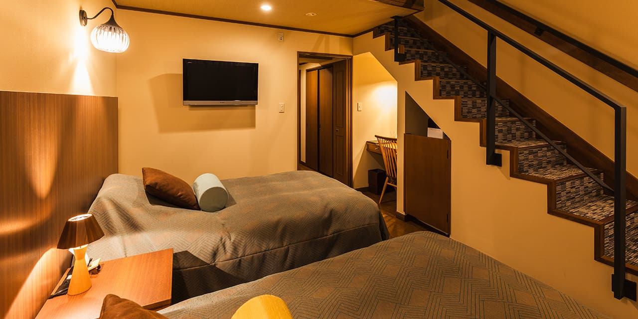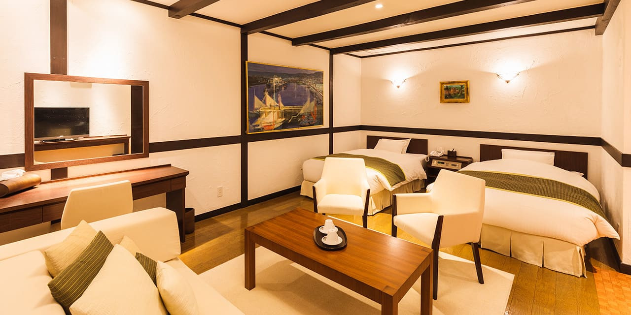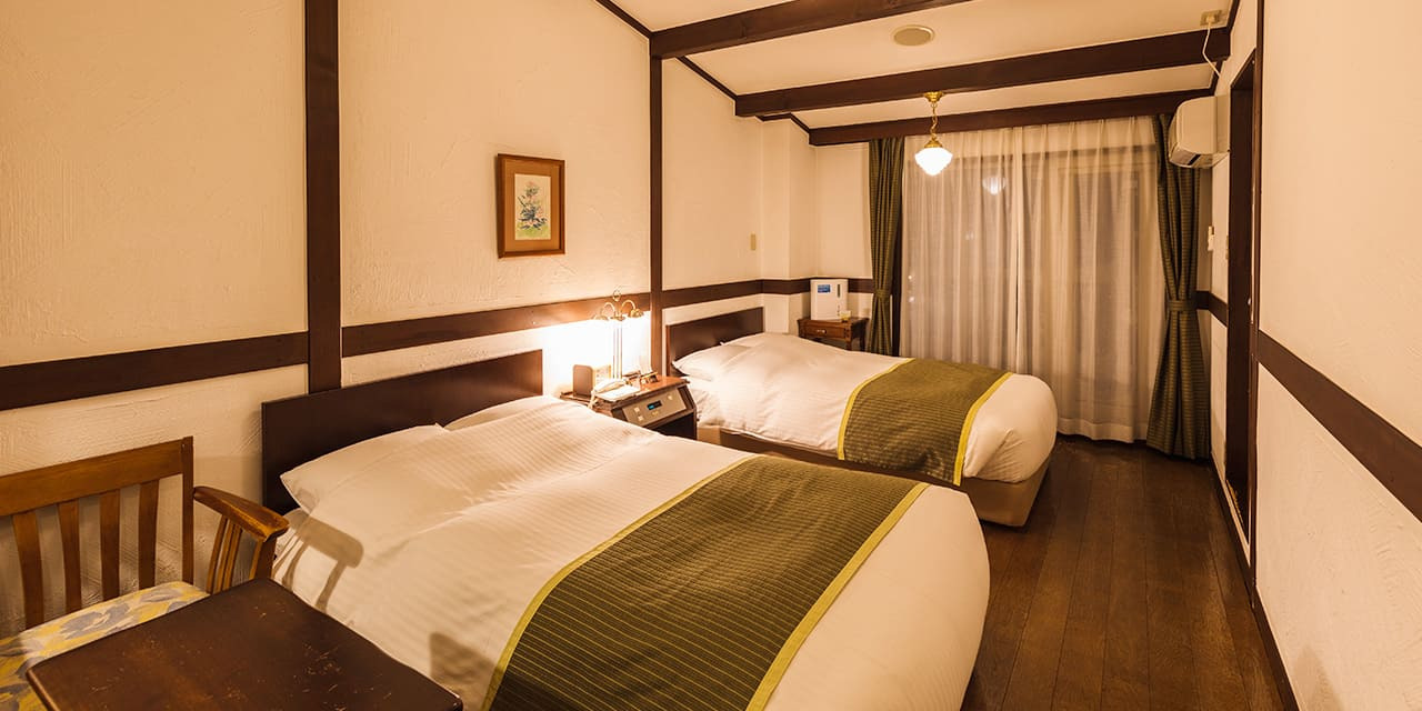 客室は木の温もりあふれるナチュラルな造りで、ヨーロッパの山荘を思わせる落ち着いた空間。コンフォートツイン以上の客室には展望風呂も備え、自然に包まれながら心ゆくまで寛ぐことができます。