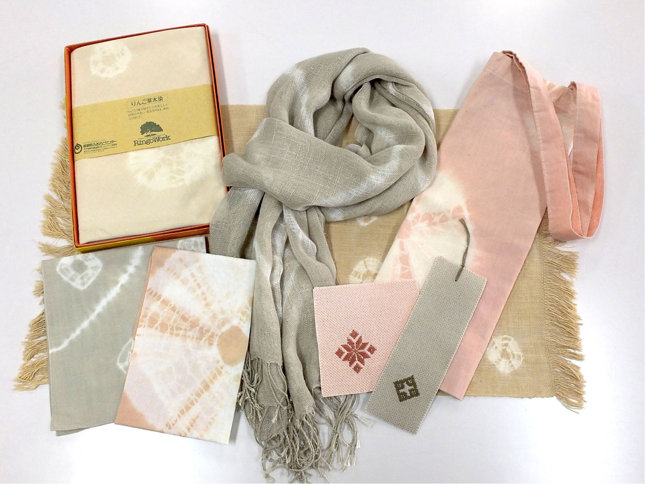 りんご草木染工房では、りんごの葉や樹皮で染められた自然な色合いが魅力です。