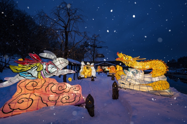 青森屋敷地内の公園にて、青森の夏の風物詩であるねぶたを、雪景色の中で鑑賞できるプログラムです。干支と青森にちなむ要素を掛け合わせた、個性あふれる6体の干支ねぶたが登場します。力強い造形や鮮やかな色合いを間近で鑑賞でき、白い雪とのコントラストが美しい幻想的な景色を楽しめます。