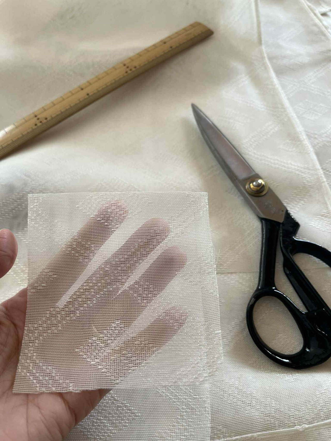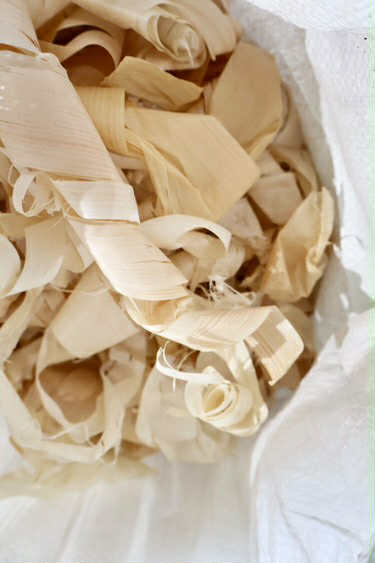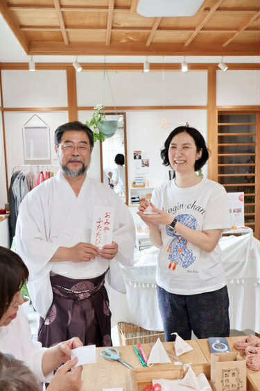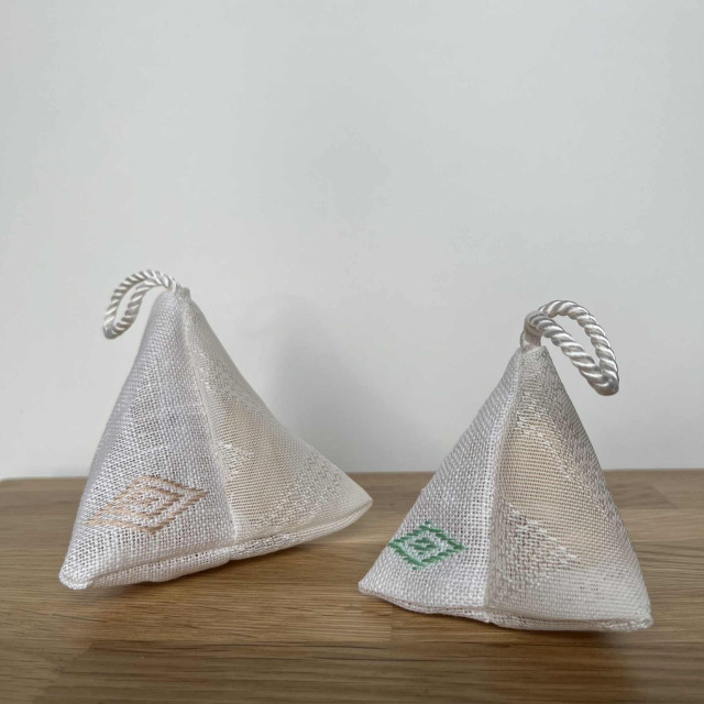 天照大神を祀る五所川原神明宮。360年以上の歴史がある神社が、令和6年3月に原因不明の火災で拝殿が全焼しました。そこで再建を目指すクラウドファンディングの返礼品として生まれたのが、ひばの鉋屑を入れたこぎん刺しの香り袋です。使用しなくなった神職の狩衣をほどいたものと、有職模様を津軽の伝統工芸こぎん刺しで施した布を組み合わせます。製作した後は正式参拝をして直会(なおらい)をし、解散となります。